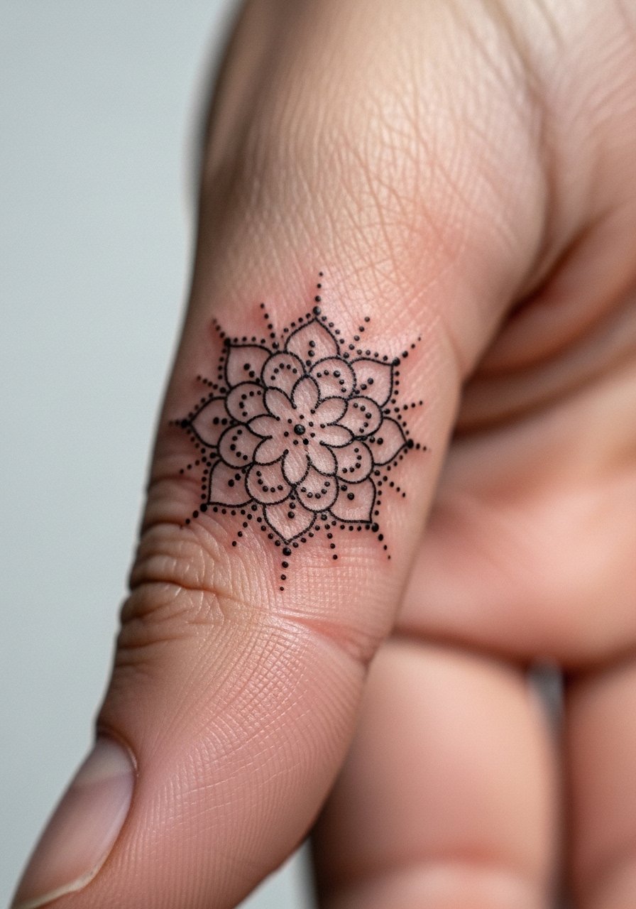 I love how a mandala reads like a henna crown on the hand. Visually, the symmetry draws the eye and reads delicate even when healed. This placement can sting a bit near knuckles, but the shape suits single-session work. Expect surface healing in 2–3 weeks; dots and hairlines can blur if too thin—I've seen artists recommend slightly bolder single lines to keep the pattern readable after a year. Ask for micro-dot shading that isn’t razor-thin.