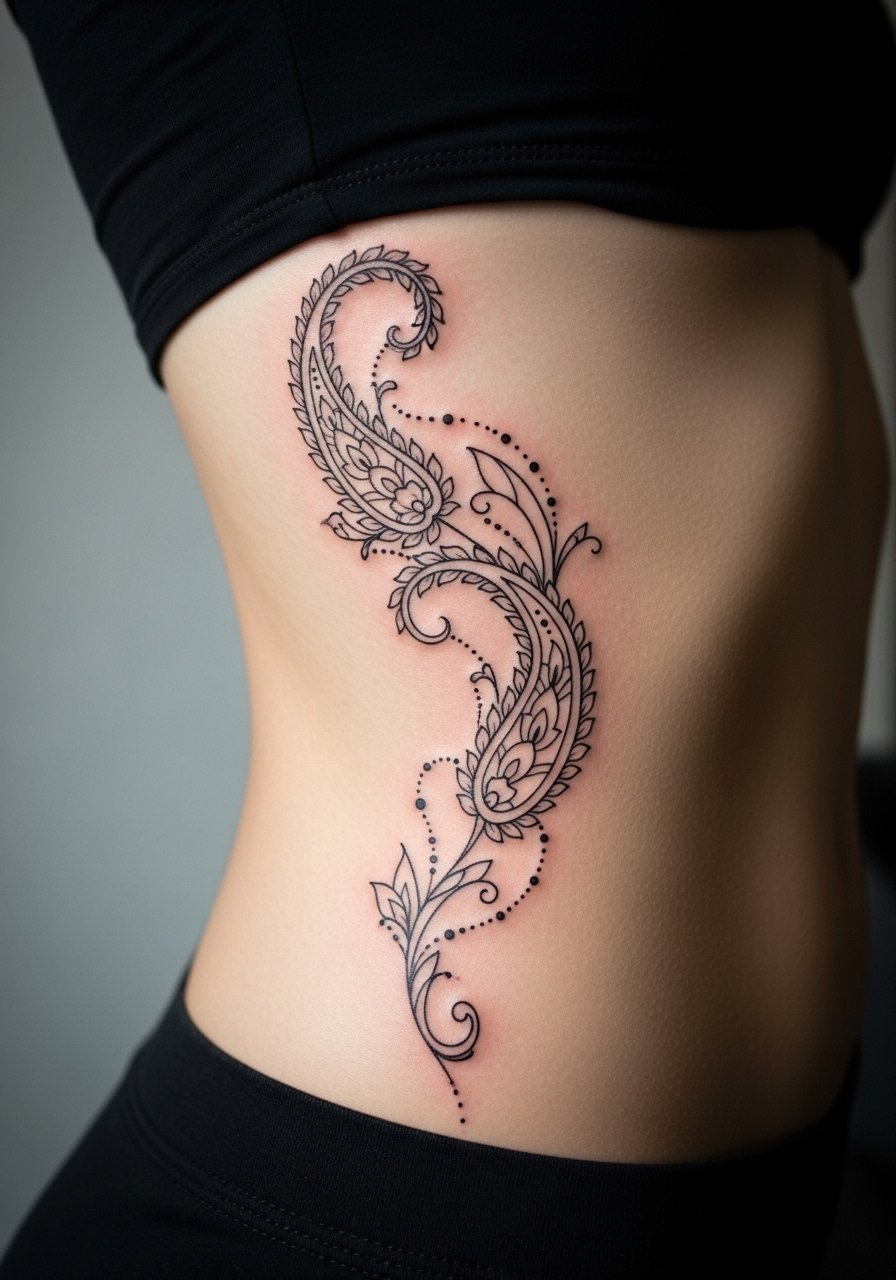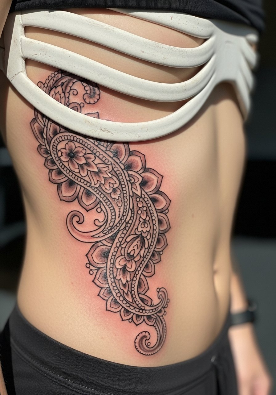 Ribs are a classic painful spot, but paisley cascades hug the body beautifully. I’ve recommended this to friends who want something private and sensual. Expect longer healing as movement and breathing affect scabbing. Artists should avoid ultra-fine filler lines in that area because stretch and healing can soften them into a gray wash.