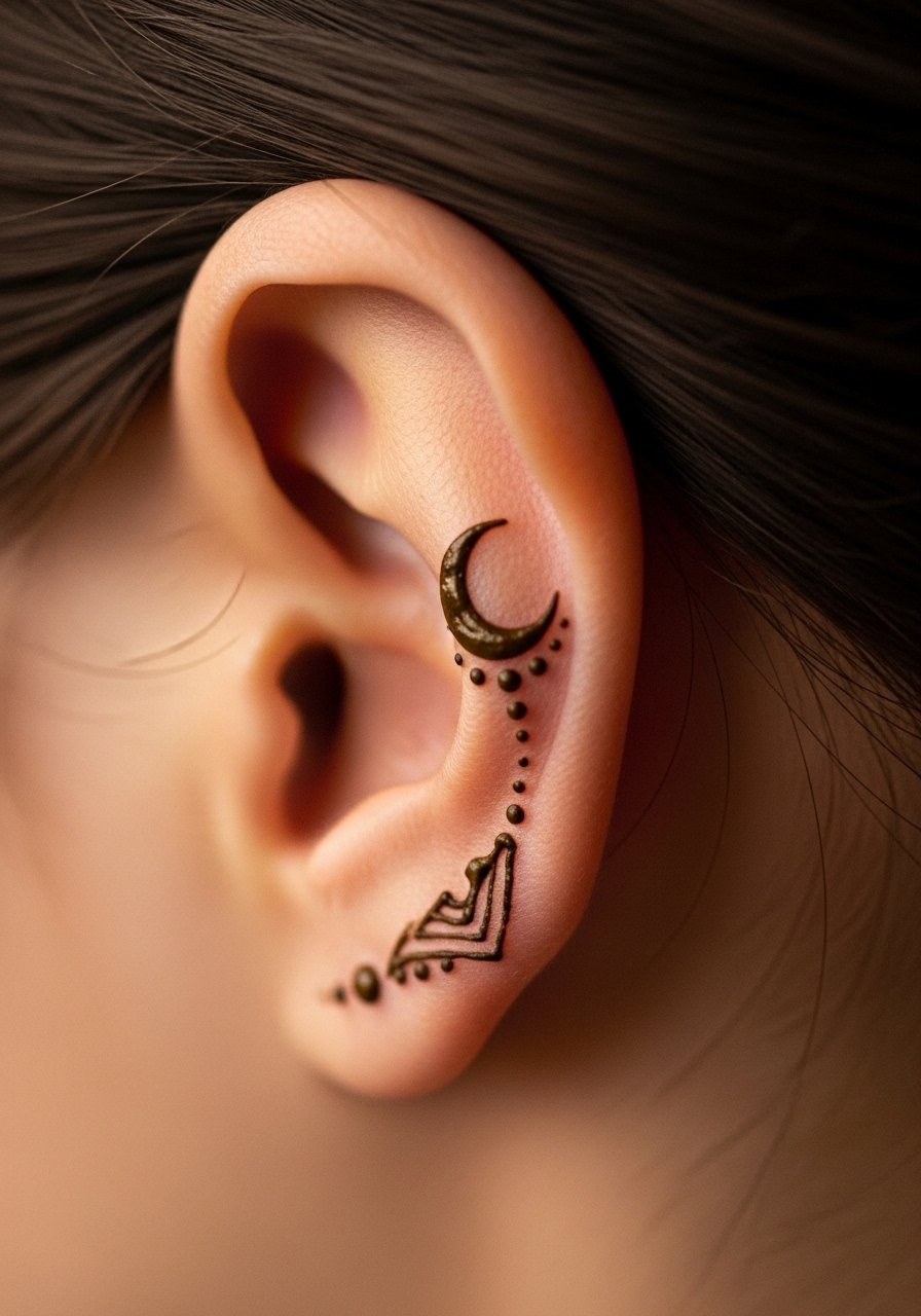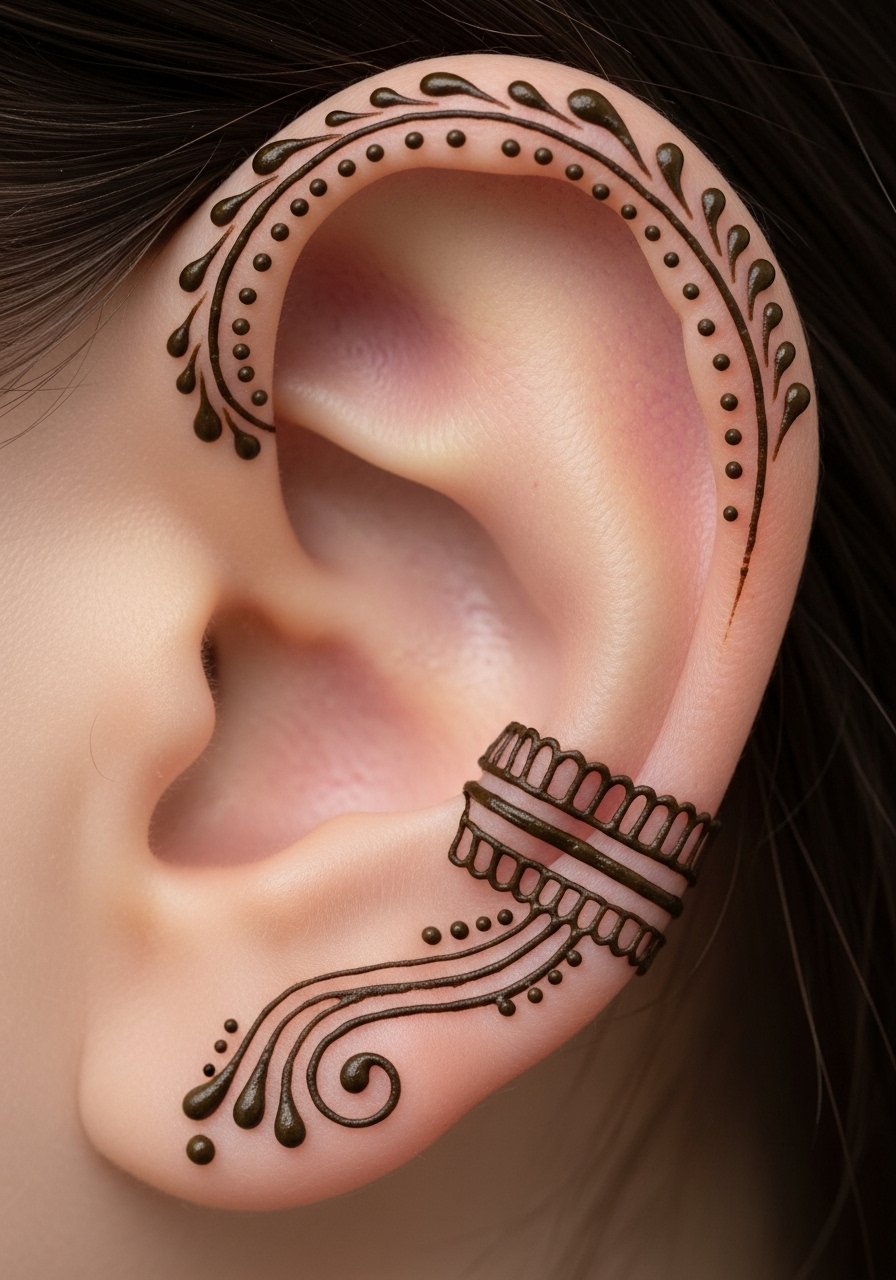 A behind-ear motif is a discreet way to wear henna-style ink. It’s quick and low pain, but watch for placement under hair—friction can reduce longevity. I’ve found simple single-drop designs with a bold dot center last best. Artists should avoid wasted filler that adds healing risk for little payoff.