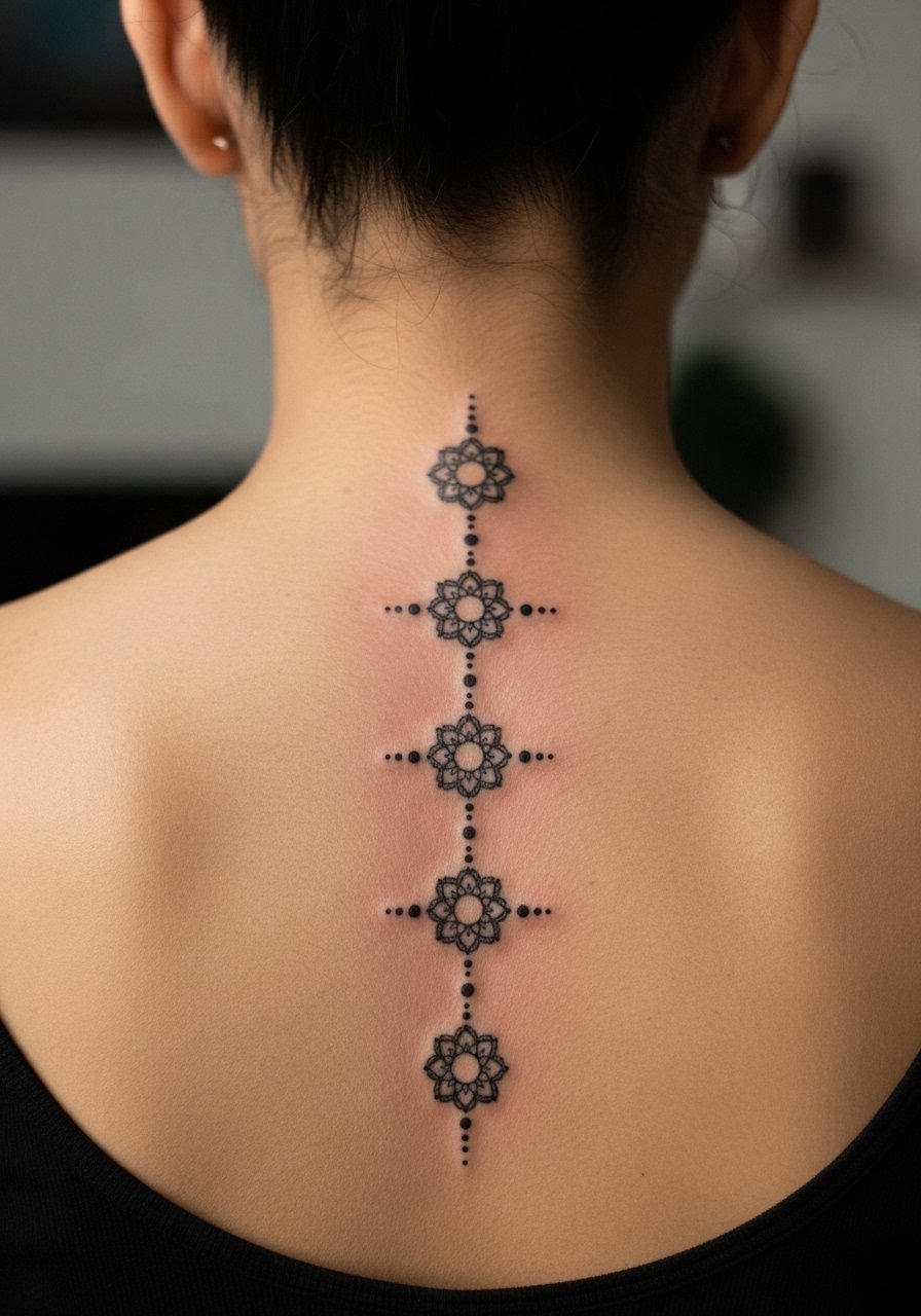 A spine compass composed of linked mandalas reads like a henna column. The vertical flow flatters the back and holds detail well in healed ink. Pain varies—closer to spine is more intense. I advise spacing the mandalas so each can breathe; overcrowding makes the column look muddy after a year. Ask for slightly stronger central motifs and lighter linking dots.