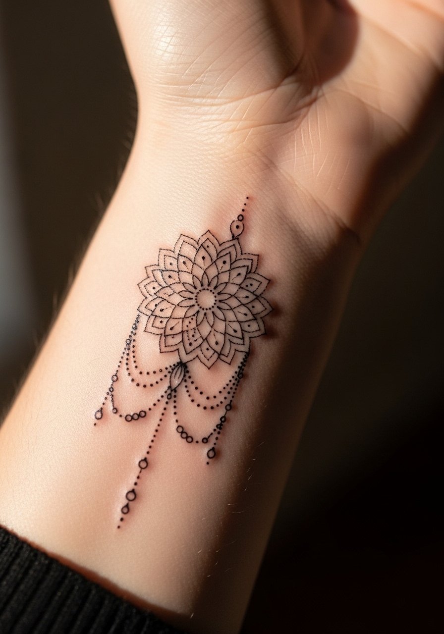 A repeating paisley band instantly reads henna-inspired jewelry. It’s low on the pain scale and easy to hide under bracelets. The wrist is prone to rubbing, so I’ve noticed bands hold best when artists use slightly thicker outlines and tight dot fillers. Healing is straightforward—avoid chokey bracelets while it scabs. Common mistake: over-detailing the band with ultra-fine dots that merge over months. Ask for artists experienced in ornamental repeat patterns.