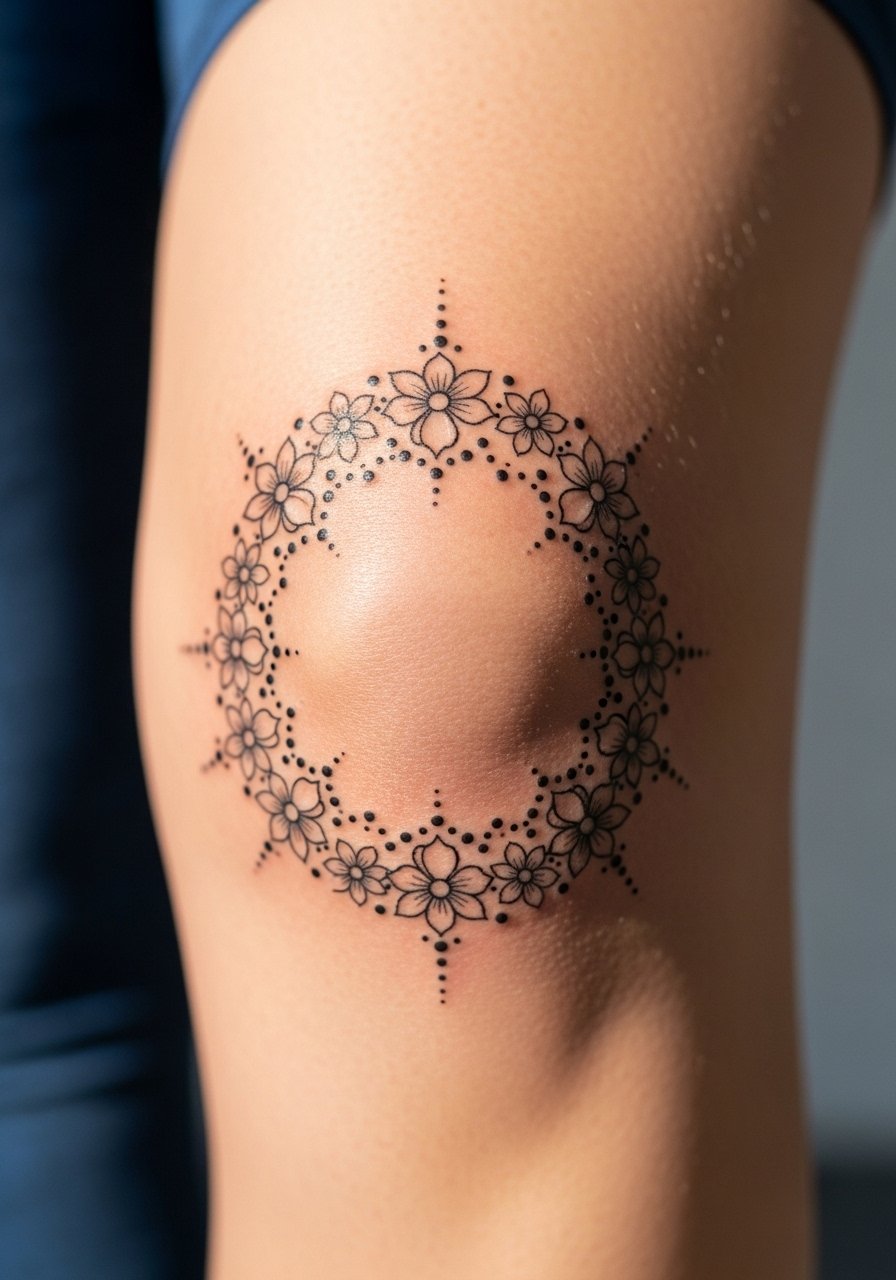 Knee caps are sensitive and move a lot, but a halo reads like henna festival ink. Pain and healing are notable—bend carefully while it sets. I advise slightly thicker primary lines and minimal micro-dots to keep the halo readable through wear. Avoid placing the heaviest detail over the most mobile skin.