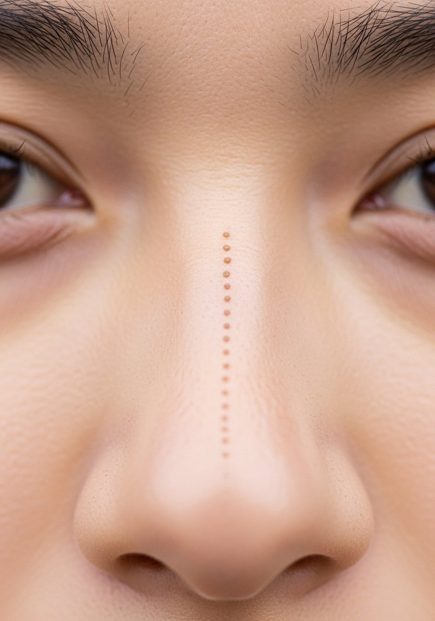 Style/Technique: Tiny vertical dotline between brows or on the nose bridge