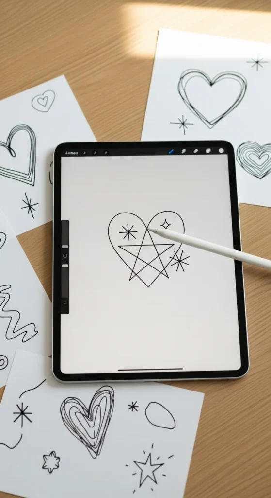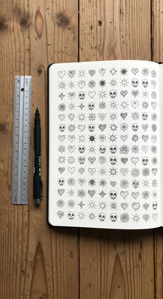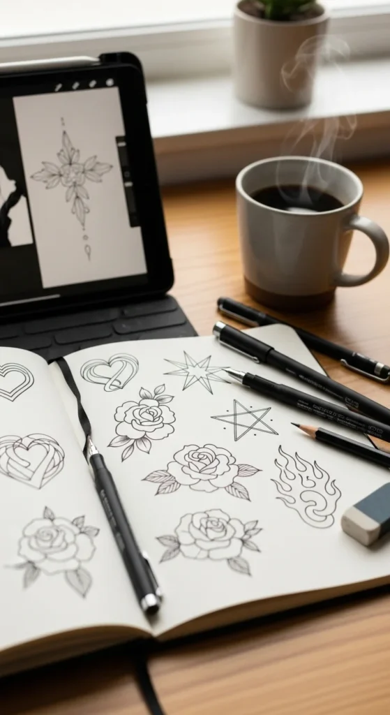 Designing tattoos at home can be really fun and creative—as long as you treat it as art practice, not a DIY tattoo session on your skin. Simple hearts, stars, and tiny roses are perfect for learning how to draw clean lines and balanced shapes that would later look great as real tattoos.