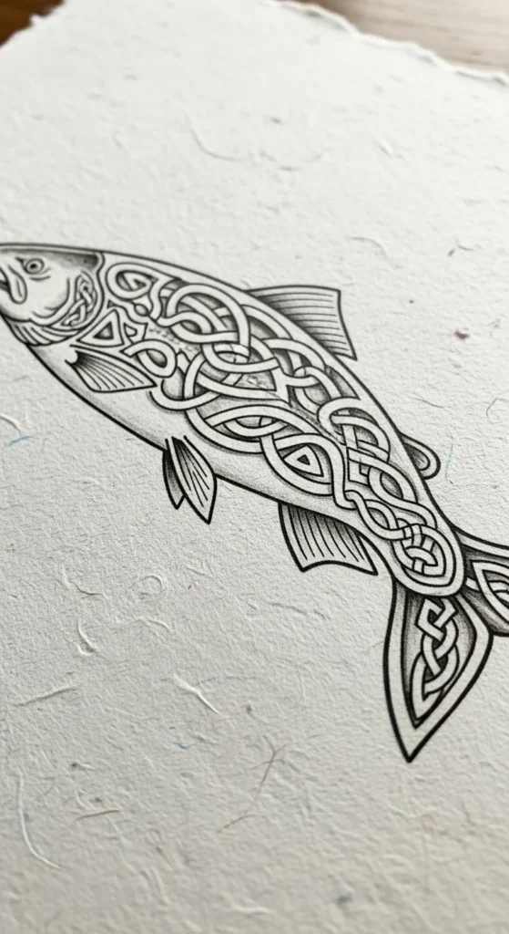 In Irish lore, the salmon represents wisdom. A simple curved fish outline with a few knot lines works nicely. It fits well on the arm or behind the shoulder. To sketch it, draw a long oval, add a tail, then include two or three spiral touches. For a budget-friendly tattoo, stick to thin lines. Try a temporary version using a printed stencil to adjust size.