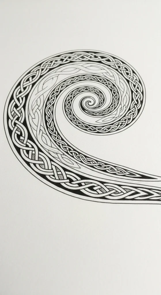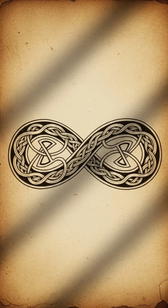 This tattoo works well when you want something subtle. The looping pattern feels steady and grounded. Most people place it on the wrist or inner arm because it fits small spaces. You can sketch a few versions at home using a pencil and tracing paper. Try outlining a simple loop first, then slowly weave the strands. Keep the lines clean. If you want a very thin tattoo, mention that to your artist to help lower the time and cost. For a DIY temporary version, use a skin-safe brush pen and trace the shape over a stencil you make from cardboard. This lets you test placement before booking an appointment. Pair it with soft shading if you prefer more depth.