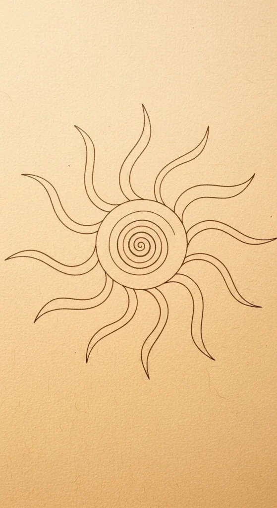 This design offers warmth and balance. Start with one large center spiral. Add thin rays around it. Keep the rays short so the tattoo stays simple. A small version fits well near the collarbone or side of the wrist. Practice drawing a few variations at home, adjusting the spacing. A temporary sketch helps you see how it looks on curved areas like the shoulder.