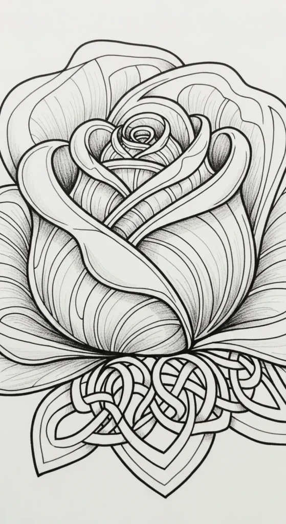 This is a gentle design with cultural flair. Keep the petals simple so it’s not too time-consuming. Try outlining a basic rose, then adding one or two looped lines inside. For a soft look, skip shading and leave open space. Test placement by printing a few sizes. This design works well on the forearm or lower leg.