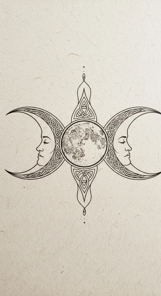 This symbol mixes lunar energy with Irish patterns. Keep it simple: three circles or arcs with a few small knot touches. Great for the upper arm or back of the shoulder. Try sketching it at home with a compass. If you want something tiny, remove the knot details. A temporary sketch helps you see how it curves with your body.