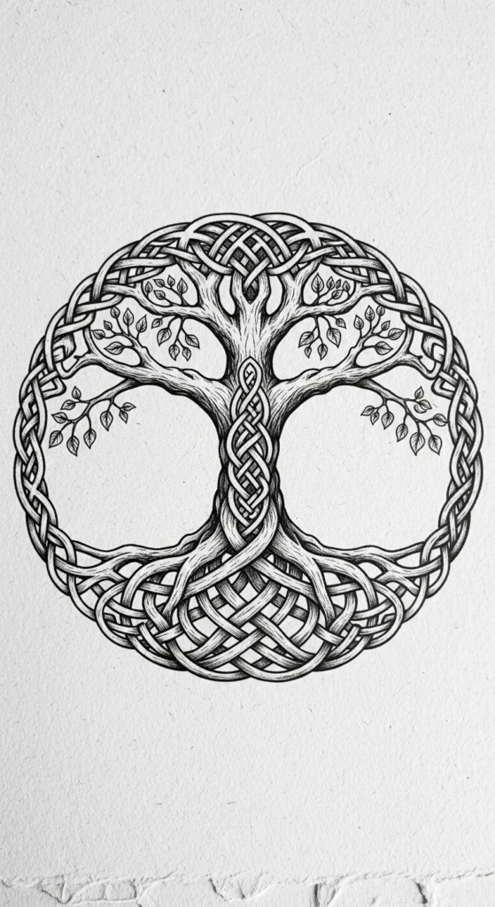 This symbol represents connection and grounding. The round shape makes placement easy. Keep the branches simple to reduce time in the chair. For a home sketch, draw a circle first. Then add a trunk splitting upward and downward. Branches can be thin and minimal. To test it on your skin, print a line-art version and tape it to different spots. A small version works well on the wrist or upper chest.