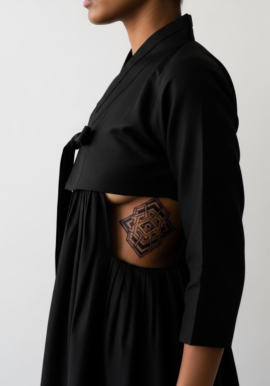 Fair warning: the ribcage is a higher pain zone, so expect a longer session and frequent breaks. The Hanbok silhouette reads well in solid black, which helps on darker skin where subtle shading can fade into the background. Ask your artist to test a small stencil patch so you can see the negative space at different angles. A common mistake is shrinking the silhouette too much, which loses the garment’s flow. Healed, this holds up because of bold saturation, but plan for a touch-up if pregnancy or major weight changes are likely.