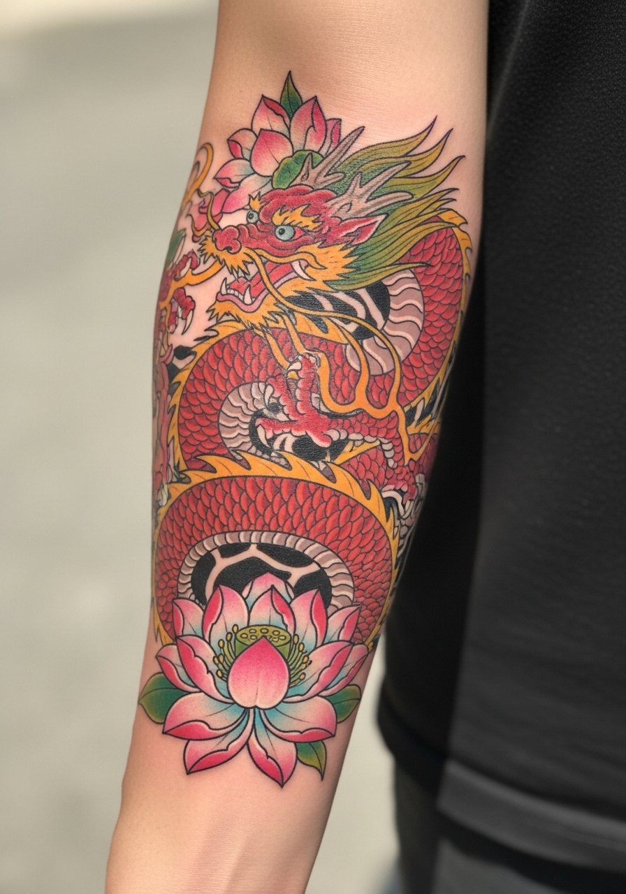 There is something about a coiling dragon that reads as movement when it wraps the forearm. For beginners, scale the motif to at least four inches so claws and scales stay defined. Tell the artist you want bold black anchors under the color to protect saturation as it heals. This takes multiple sessions and can feel long, so numbing options may be useful for comfort. Expect yearly touch-ups if you keep bright reds intact. Avoid tiny scale detail near joints to reduce blowout risk.