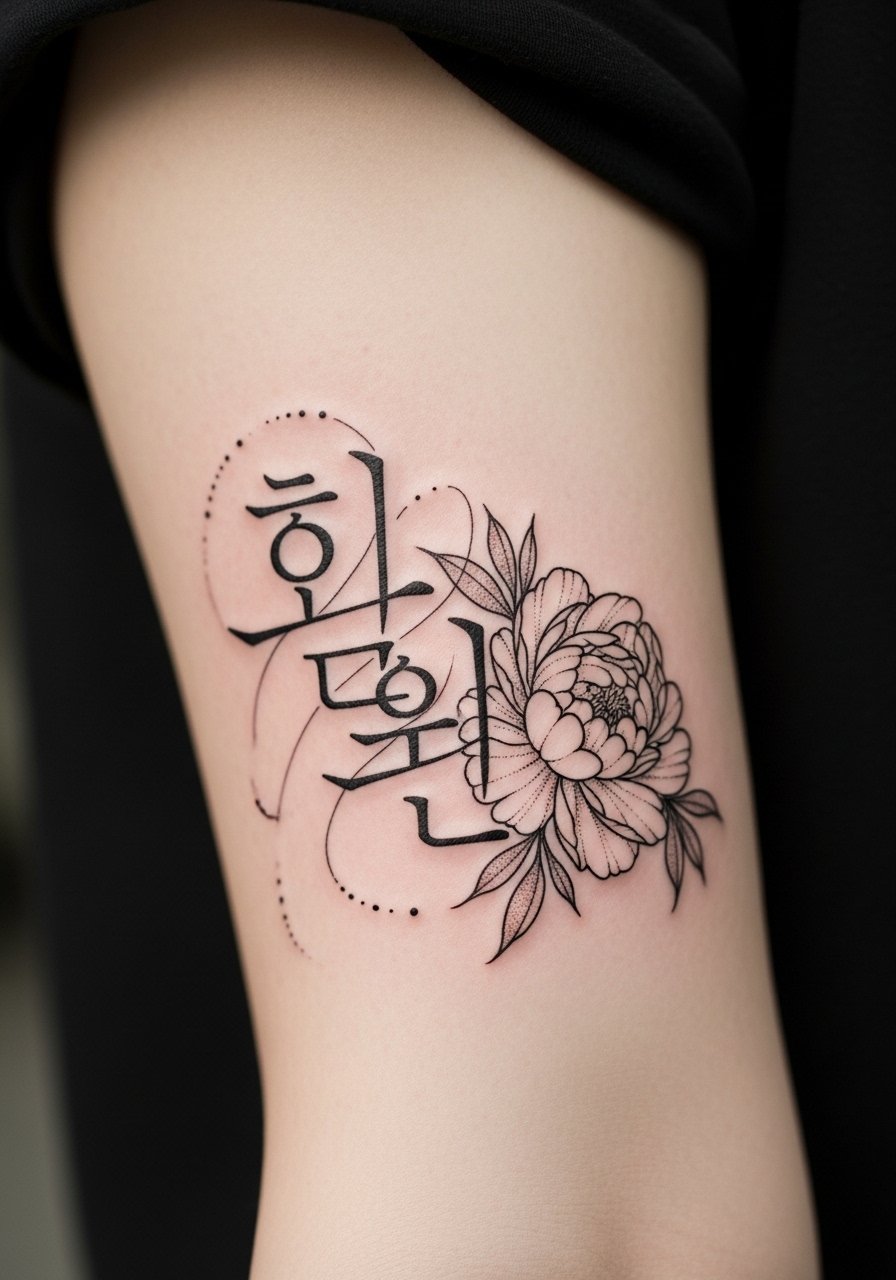 10. Fine line Hangeul interwoven with peony on inner bicep