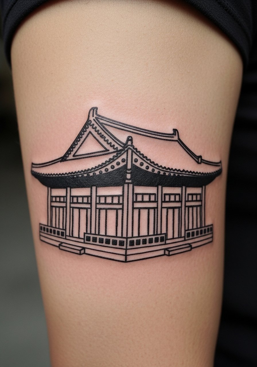 Architectural outlines read best when they respect the natural curve of the quad, so request a stencil mockup and pose during the consult. The quad accepts bold blackwork well which helps on darker skin tones where fine gray shading can fade. The mistake is shrinking complex rooflines too small, which causes detail loss. Session time is moderate and you may schedule a single session if the piece is kept to mid-size. Tell the artist you want strong linework that resists blowout along the muscle edges.