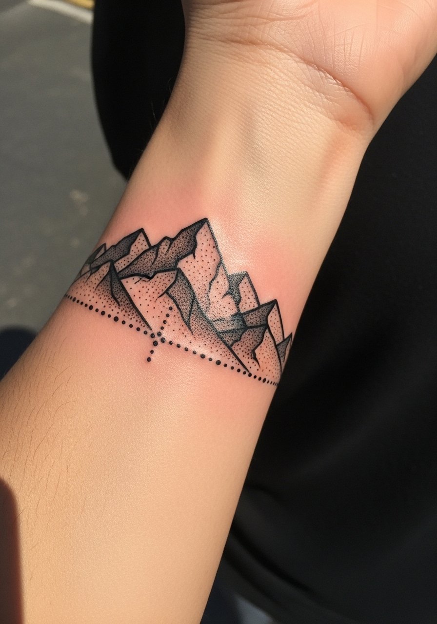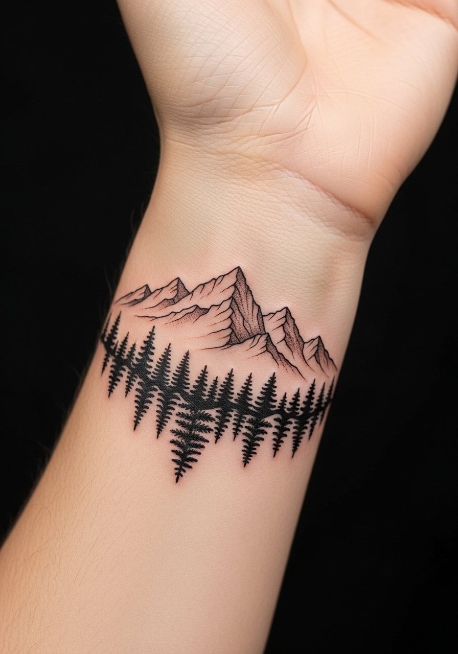 Geometric mountain bands use sharp angles and negative space to suggest peaks. I like this for the inner forearm because the flat canvas keeps lines straight and shows texture as it heals. Pain is moderate—the inner forearm is tender but tolerable. Healing is straightforward: expect 2–3 weeks for surface flakes and 2–3 months for full settling. Fine line geometry looks crisp fresh but can soften over years if lines are ultra-thin; ask your artist to bolden critical lines slightly. Common mistake: asking for too many tiny triangles—simplicity reads cleaner healed. Mention you want consistent line weight and a reference for healed examples during your consult.