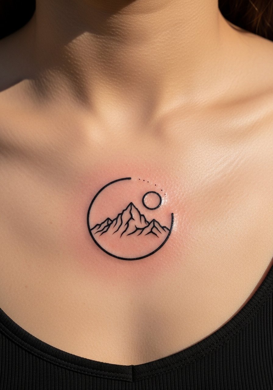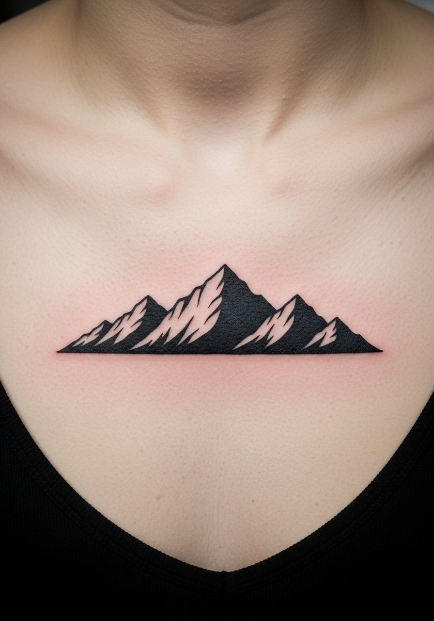Negative-space mountains invert the usual approach—solid blacks carve out the peak. On the sternum edge, it’s dramatic but painful. This technique ages well because the black stays legible, and the negative sun stays crisp if executed with clean borders. Common mistake: using thin negative details that can bleed; ask for slightly thicker negative shapes. Mention you want healed photos of negative-space chest work.