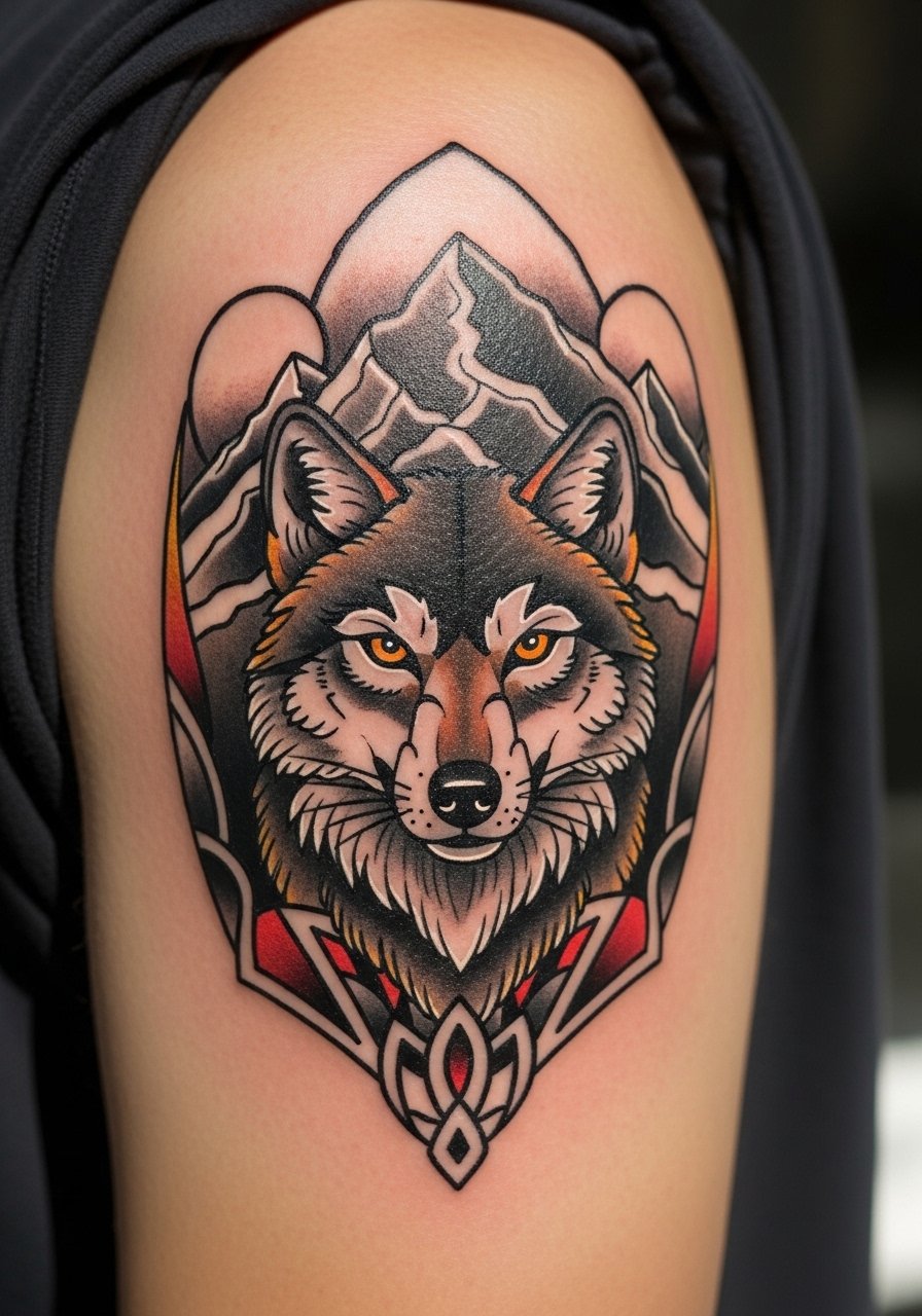 Neo-traditional allows mountains to pair with animals like wolves for storytelling. The upper arm is forgiving pain-wise and great for show-and-hide. Colors and bold lines in this style age predictably well; the heavy outlines keep the image readable as pigments soften. Healing is routine; expect surface scabbing but minimal complication. Avoid tiny text or microscopic details within the fur—they blur. In my experience, artists who work in neo-traditional styles will have portfolios showing 1–3 year healed pieces—ask to see them.