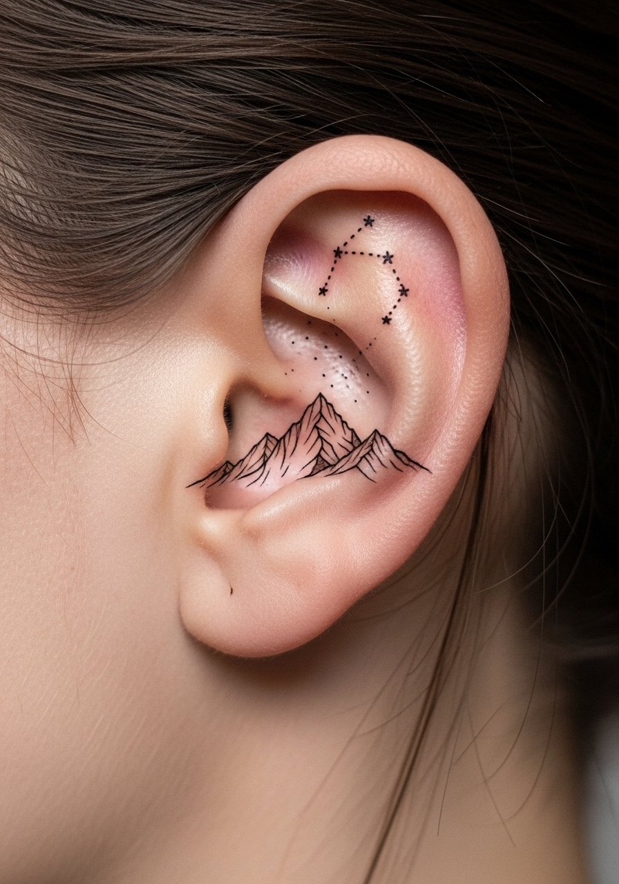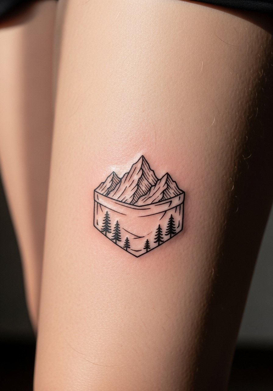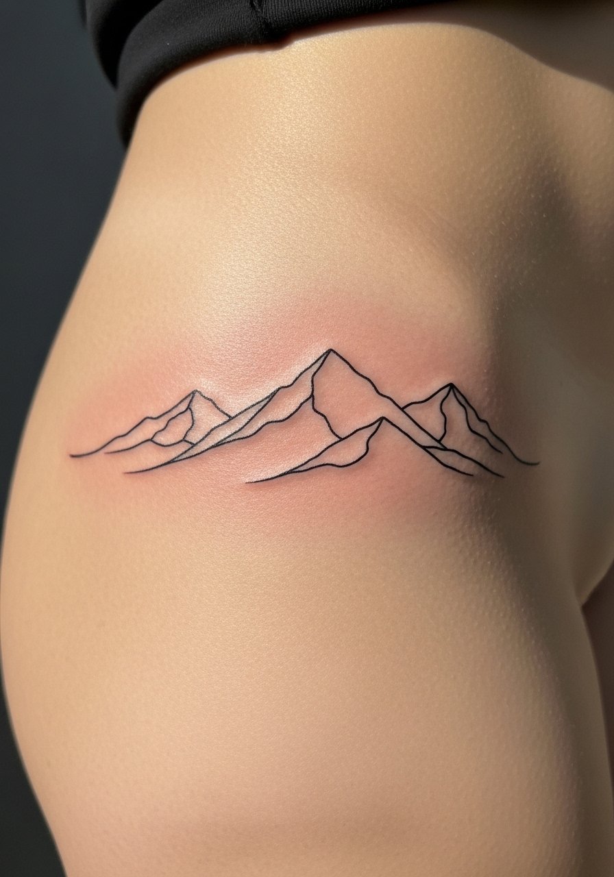 Upper thigh tattoos are comfortable to sit through and hideable for work or family. A pocket-sized mountain is ideal for first-timers who want a meaningful piece without high visibility. Healing is predictable; avoid tight undergarments during initial days. Tiny illustrative work here tends to stay crisp longer than on hands or feet. I always tell people to ask for slightly exaggerated shapes so the form reads as the skin settles.