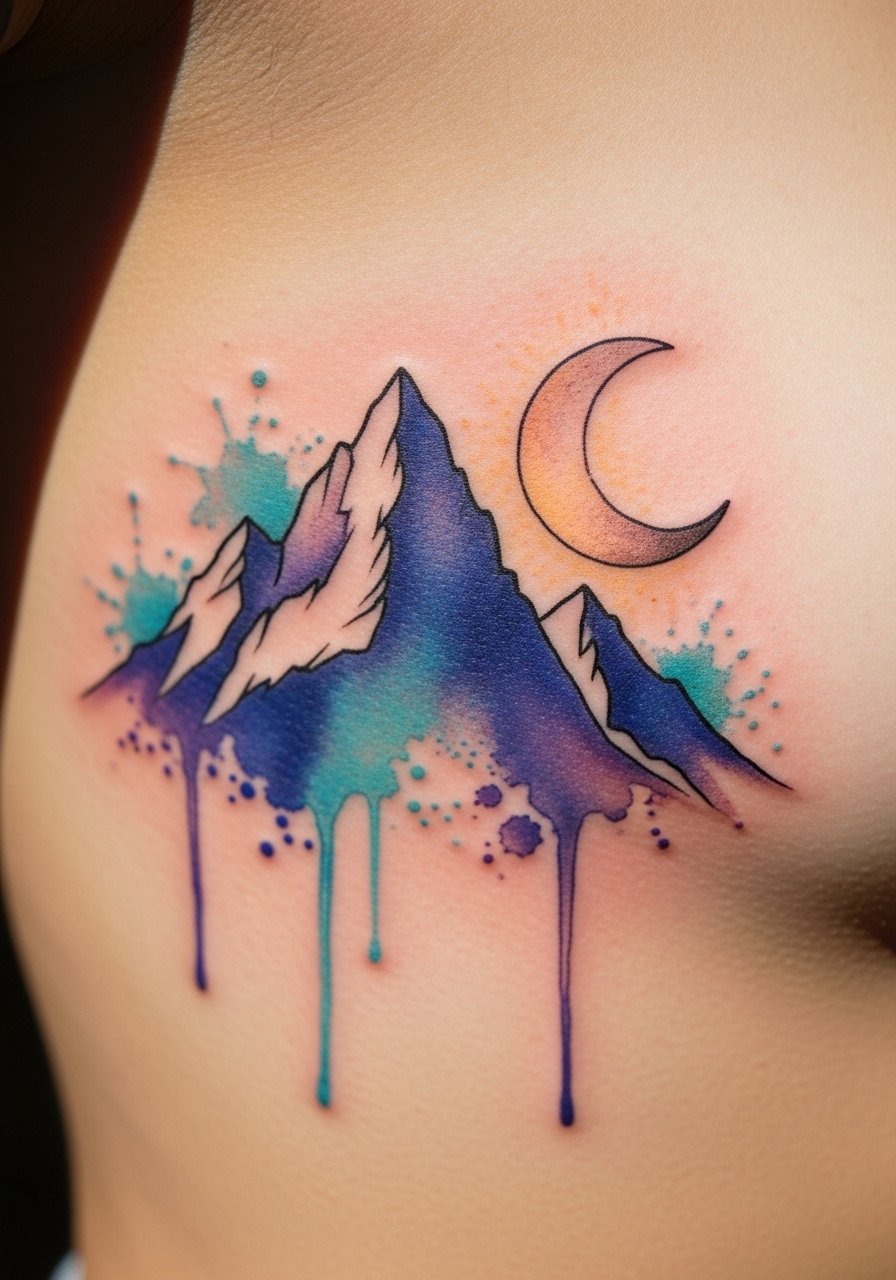 The ribcage is notoriously painful but perfect for a personal mountain and moon piece. Colors can create a soft, meditative vibe. Healing needs extra attention—tight clothing or sleeping positions that press the area will irritate scabs. Watercolor fades faster, especially on areas that stretch; plan for touch-ups down the road. From my experience, splitting the session into two helps manage pain and allows the artist to layer color cleanly. Avoid expecting crisp edges in watercolor—it's meant to be softer.