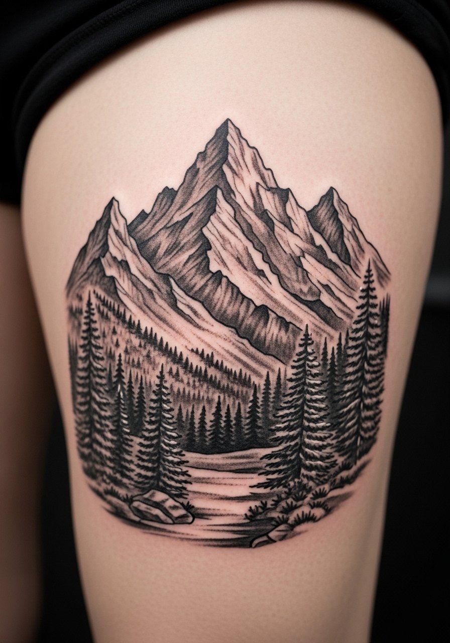 The thigh is a forgiving area for a large, realistic mountain scene. Pain-wise it’s one of the easier spots and allows for longer sessions. Realism holds well when artists use strong contrast—mid-tones can look muddy if over-blended. Expect several hours; larger scenic pieces might require touch-ups after initial healing. Avoid overly delicate tiny branches if you want long-term clarity—scale elements so the main composition reads at arm’s length. Ask your artist about healed thigh realism photos to check texture.