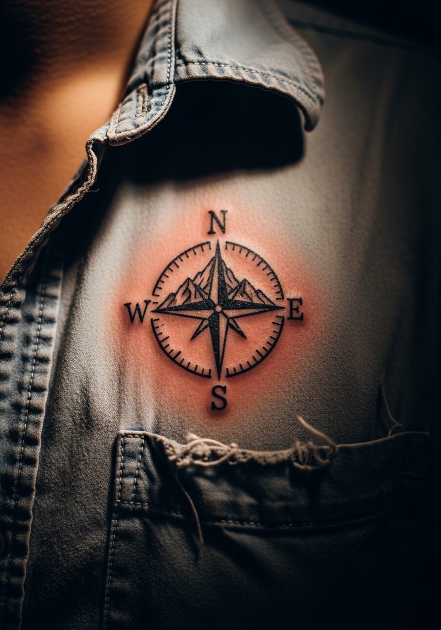 A mountain integrated with a compass is a strong freedom symbol—navigation + peaks. Near the chest pocket it sits well under shirts but is visible when wanted. The chest has variable pain depending on proximity to bone. Small color accents work nicely here and age reasonably if saturation is solid. Common mistake: asking for micro-compass ticks—keep the compass simple so it reads from a distance. Tell your artist you want clear contrast and healed examples on chest placements.