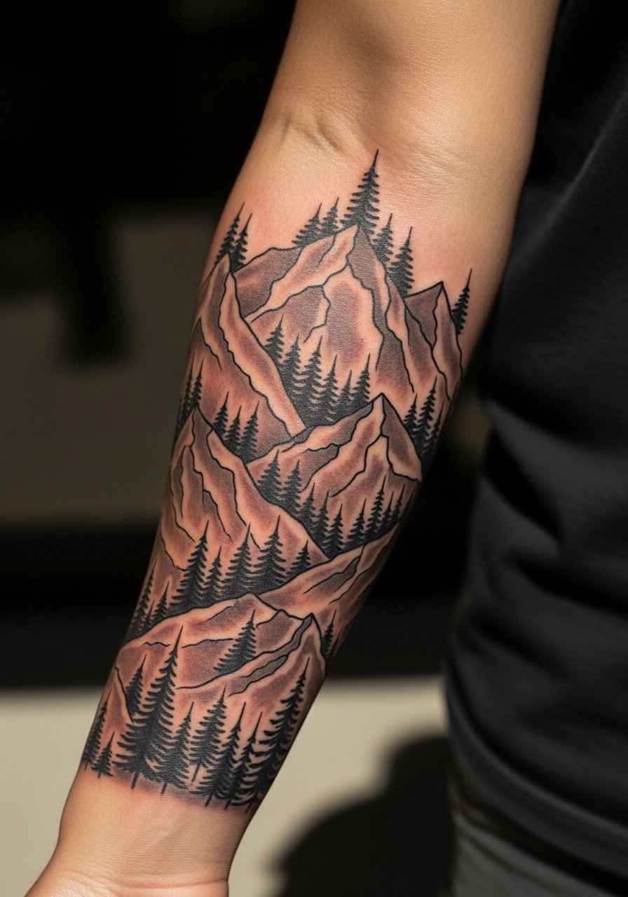 11. Forearm Landscape Sleeve with Mountains and Pines