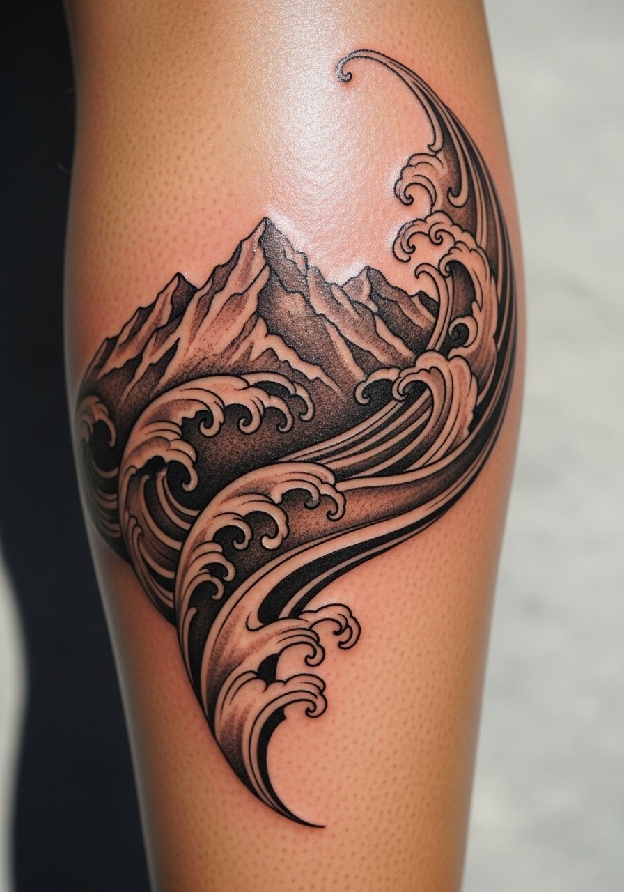 Combining mountain and wave evokes movement and freedom—land and sea. The calf is a low-pain area with great canvas space for mid-sized pieces. Lines and shading age well here because the skin is thicker. Be mindful of clothing rubbing from long pants in the first week. Avoid overfilling small wave textures that might blur; keep main elements bold and let texture live in negative space. Ask to see calf healed reference photos.
