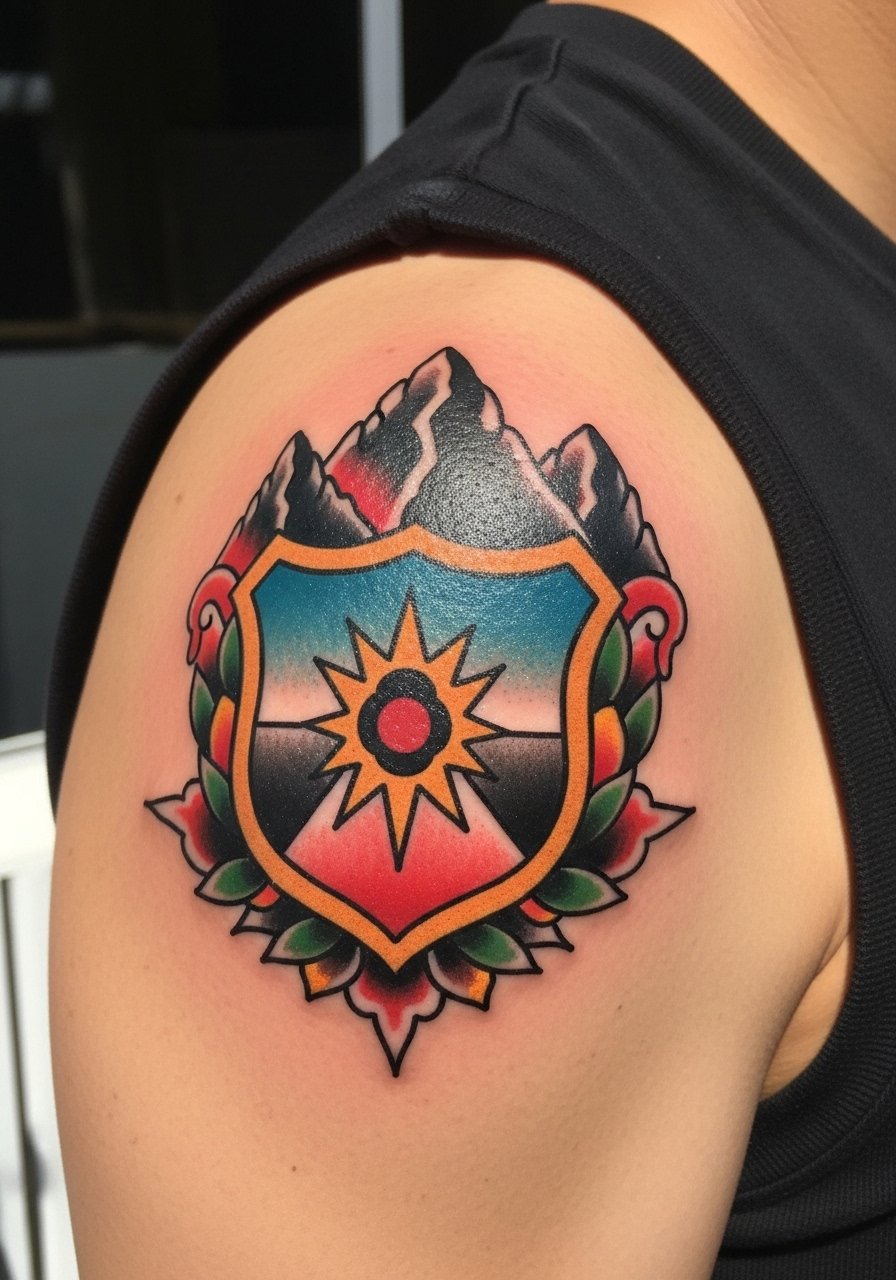 The shoulder cap is great for bold, traditional mountain crests. Pain is minimal and the area accepts color and solid outlines well. Traditional work ages nicely because heavy outlines protect interior color. Avoid overly intricate inner details; traditional shines with simplicity. I’ve seen shoulder crests maintain their silhouette for years with basic sun-care. Ask your artist about color saturation and how it heals on your skin tone.