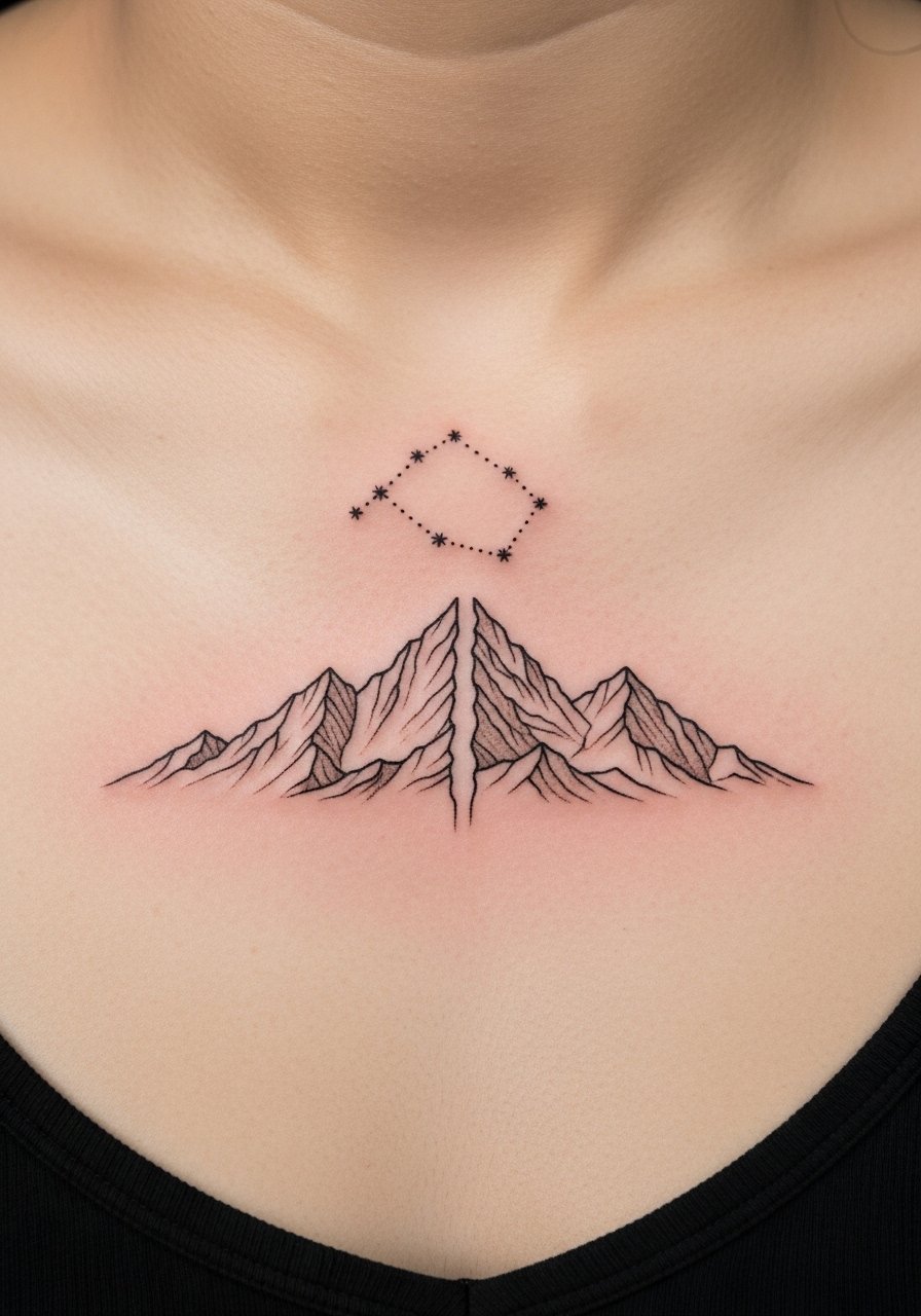 A split sternum mountain with a constellation reads like a celestial map of your journey. It’s painful and needs careful aftercare because movement and clothing can irritate healing. Dotted constellations can fade if dots are too faint; ask for slightly larger dots or small anchors. I’ve seen these look incredible healed when the artist balances dot size and line weight. Bring references that show healed chest constellation work.