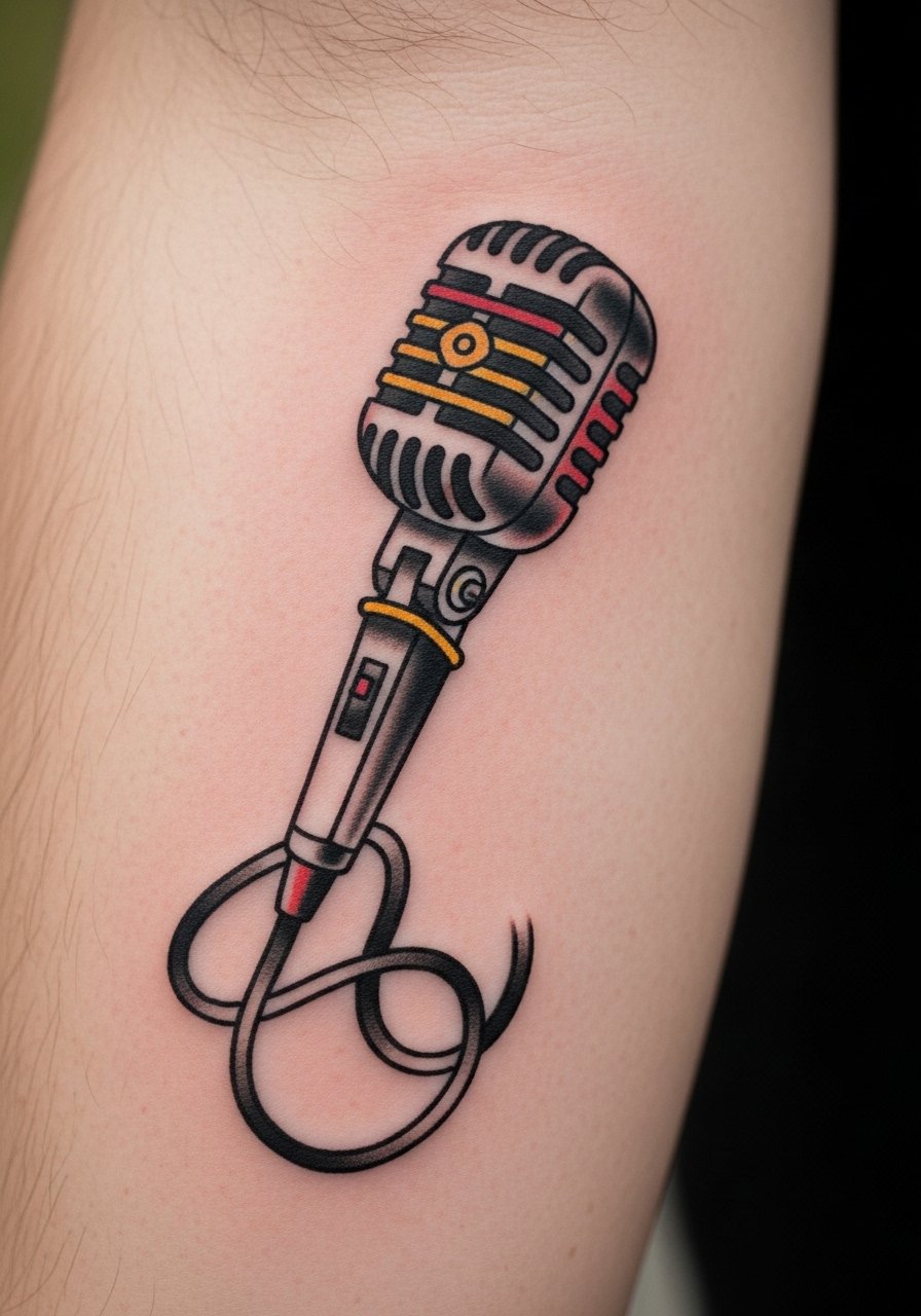 Traditional ink holds up well—heavy lines and solid blacks help music tattoos stay readable for years. Forearm placement heals predictably and is easy to protect from the sun. Pain is mild. Avoid tiny, delicate fills in this style; bold color blocks work better healed. Ask for contrast and thick outlines if you want longevity.
