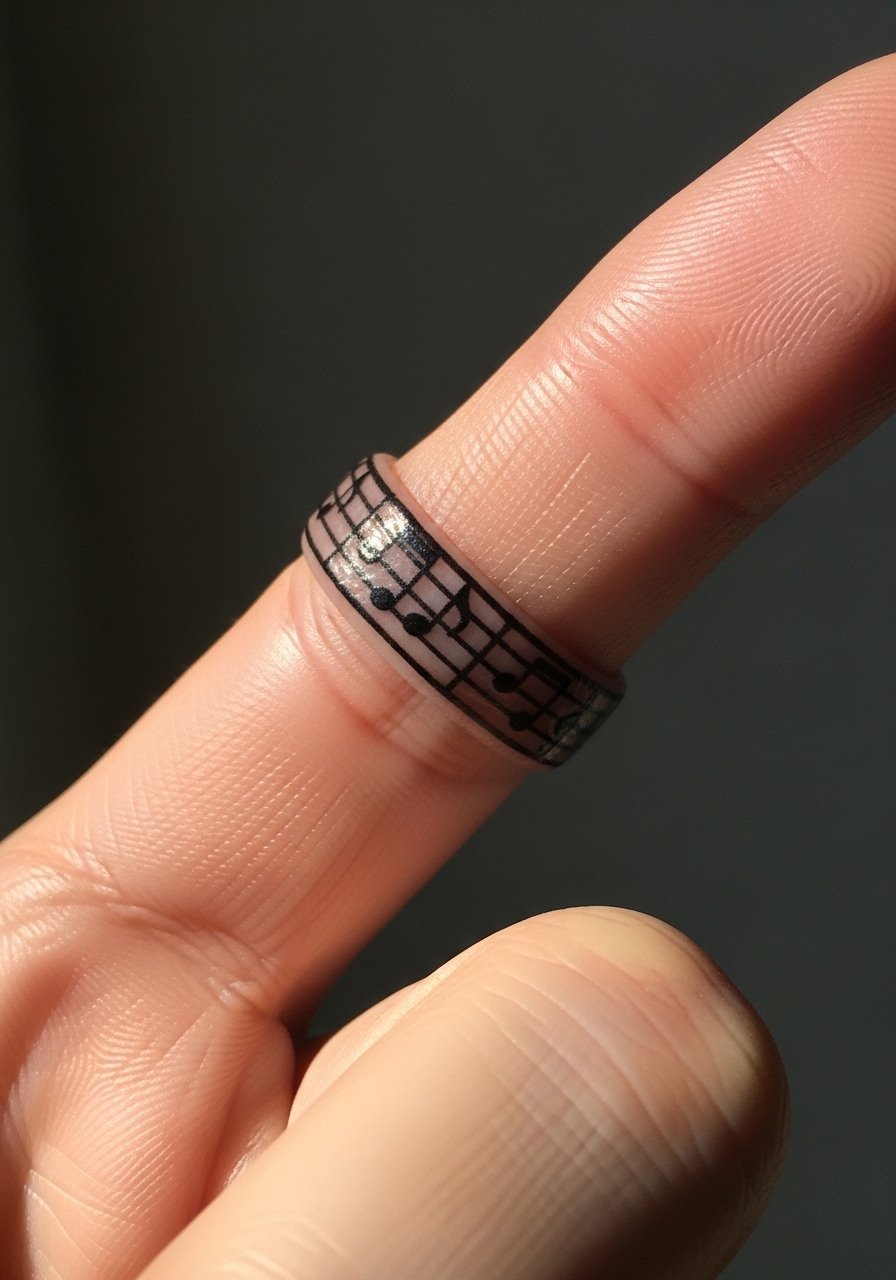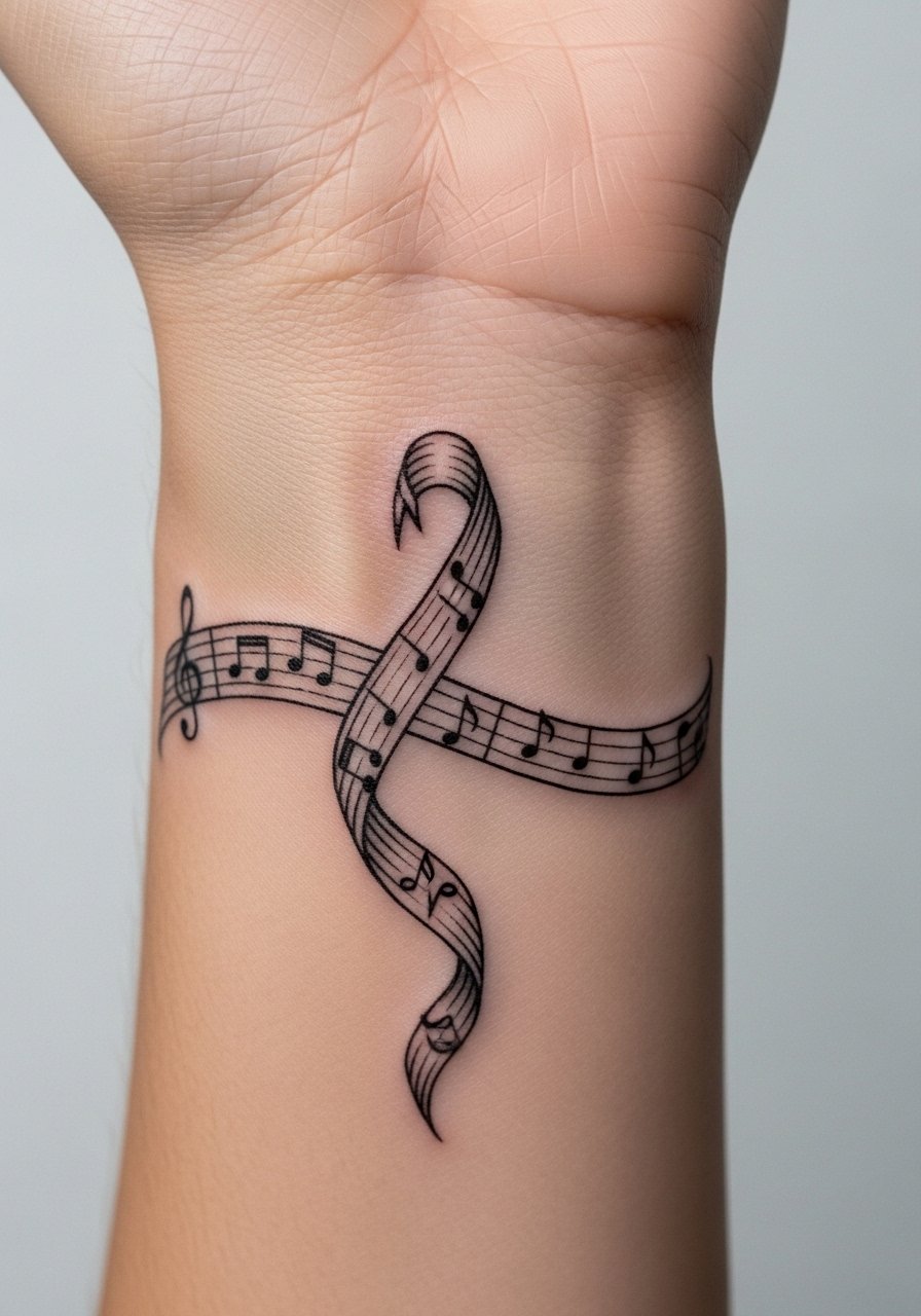 A wraparound wrist score reads like jewelry. The wrist moves and flexes, so lines can thin—expect touch-ups. Pain is sharper near the bone. Healed music notes can soften; ask for slightly heavier key lines. Common mistake: copying tiny printed staff directly—scale up spacing so notes remain crisp when healed.