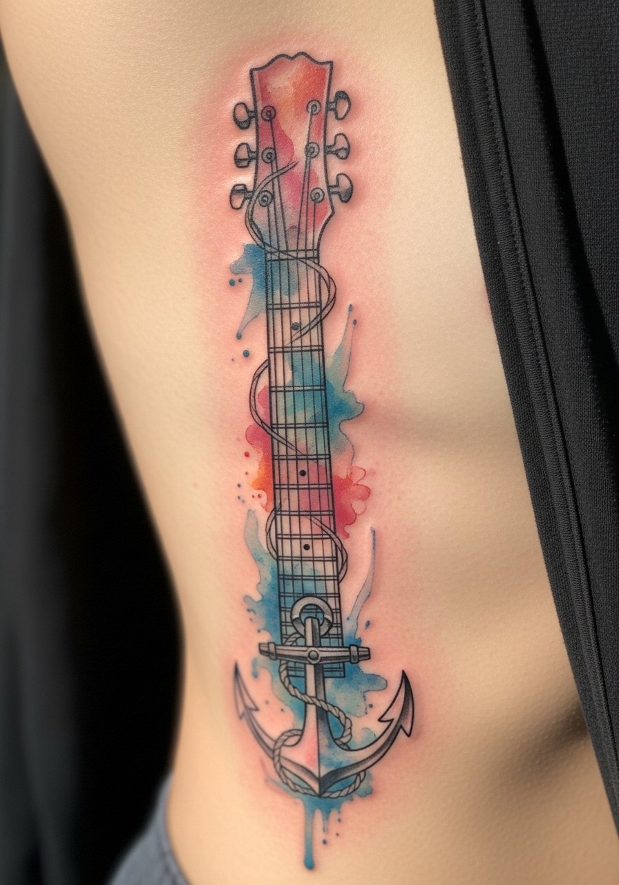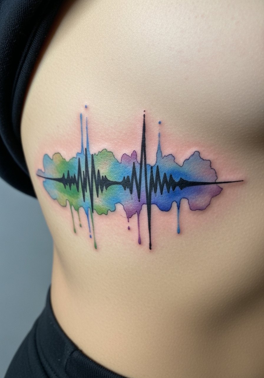 Soundwaves that represent a voice or song look intimate on the ribcage. Ribs hurt more and heal slowly, but the canvas is ideal for long, flowing color. Watercolor fades faster; for longevity, pair the wave with a black anchor line. Avoid overly diffuse color—ask your artist how they keep pigment saturated in the long term.