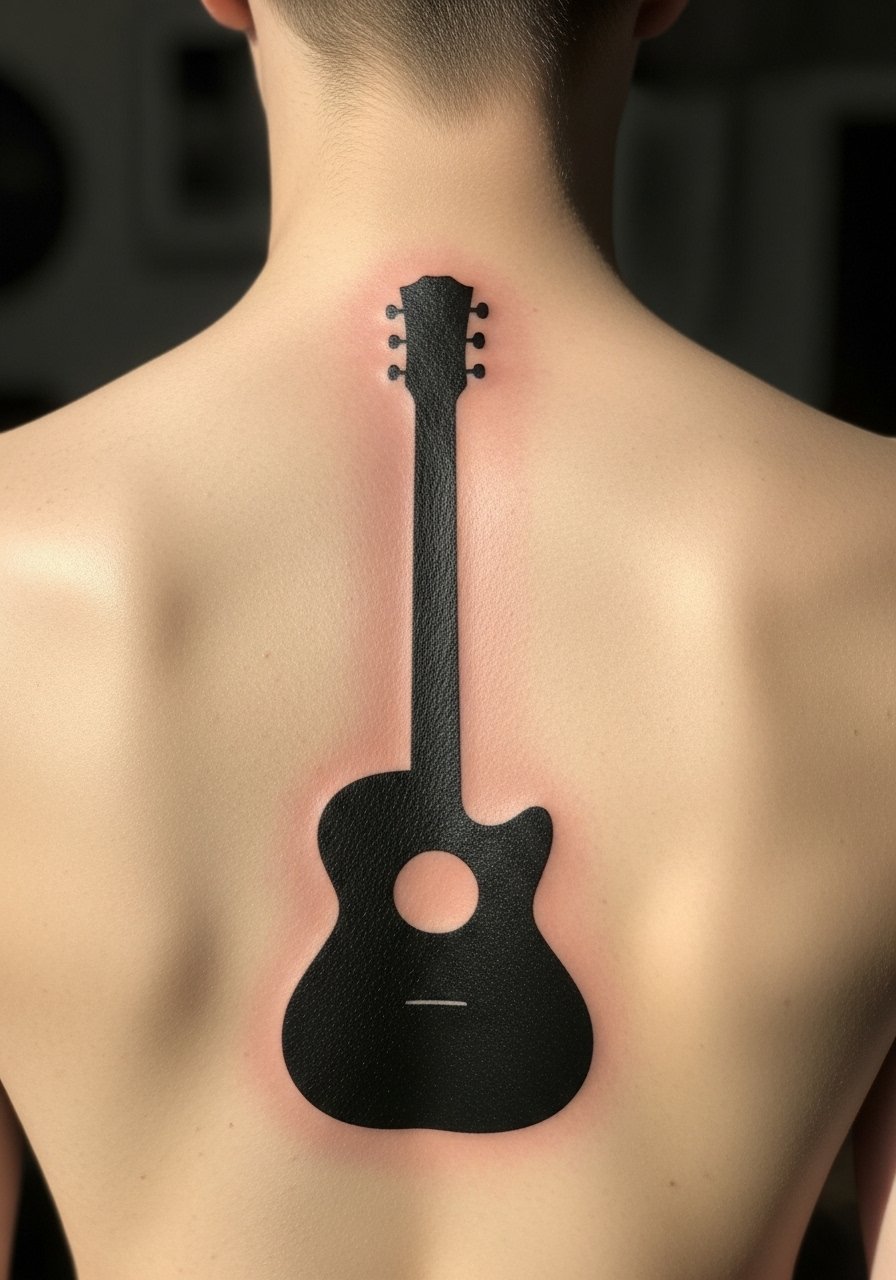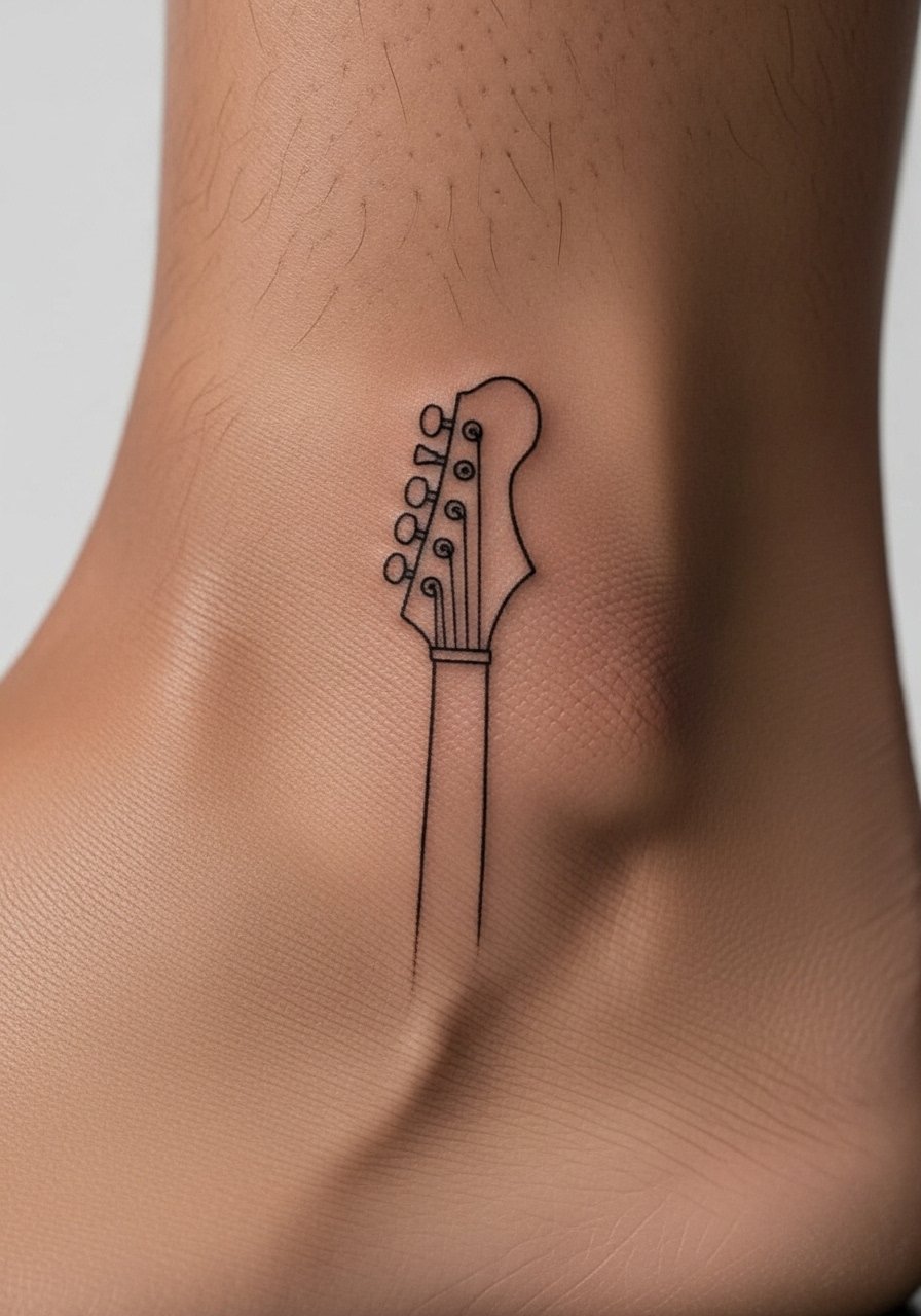 Ankle tattoos can hurt because of thin skin, but small designs heal cleanly if you avoid overly thin lines. Minimalist guitars read best with a tiny bit of line weight. Healed results maintain shape if not placed too close to joint creases. One mistake: putting it right on the inner ankle bone—more pain, more wear.