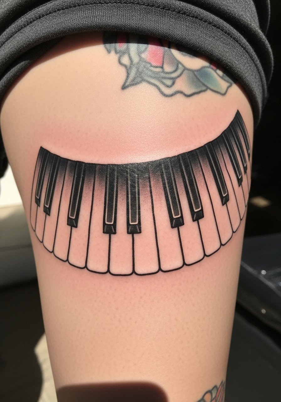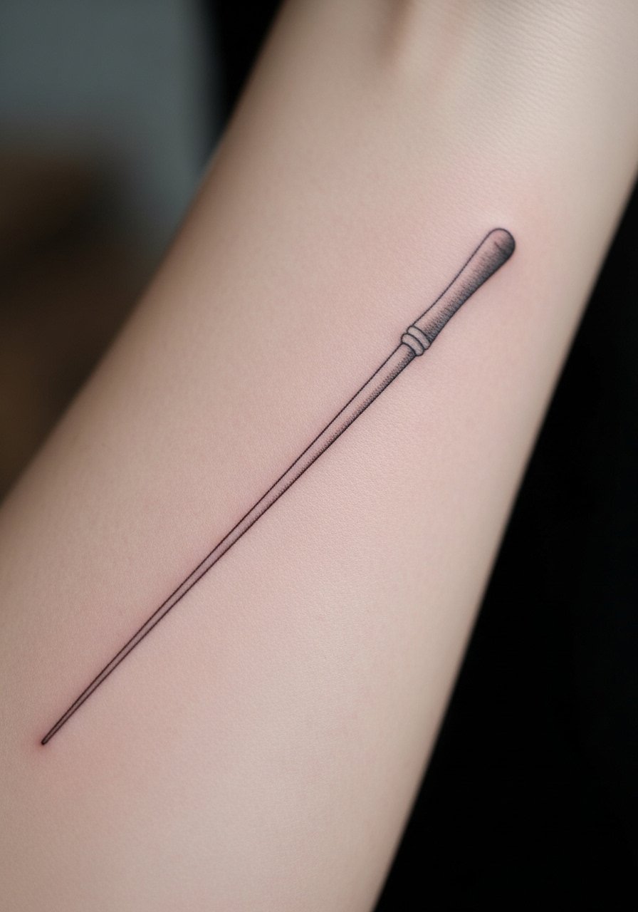 Inner forearm is ideal for readable music tattoos. Fine line batons age fine here if lines aren’t wafer-thin. Healing is straightforward; keep sun off during the first month. Avoid tiny cross-hatching that can smudge over time.