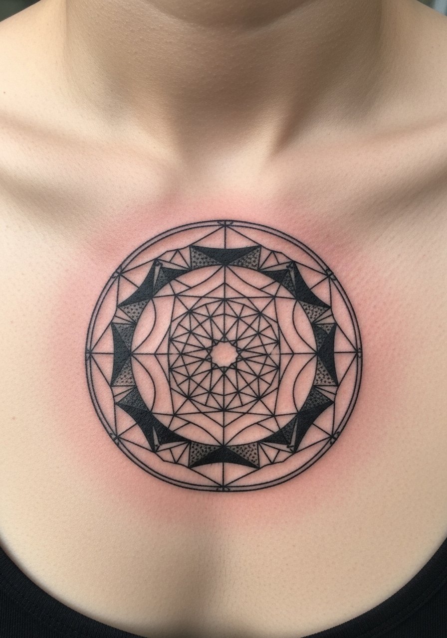 Sternum tattoos look dramatic but hurt and need careful aftercare. Geometry hides small aging issues since strong shapes remain readable. Expect peeling and sensitivity during initial healing. Avoid overly fine dotwork centered on sternum—opt for bold negative space to preserve longevity.