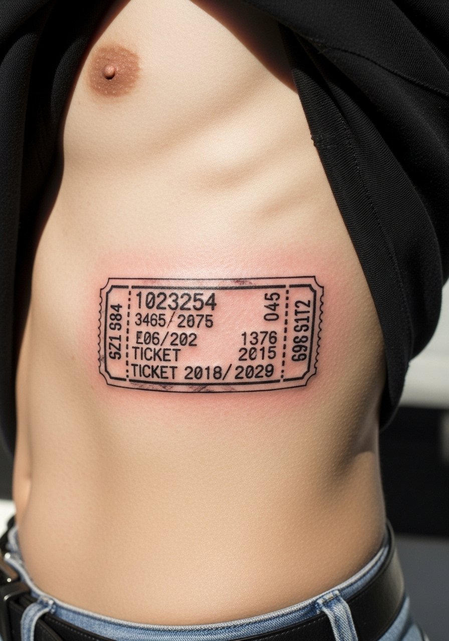 Ticket stubs translate well into music tattoos when scaled correctly. Ribs are expressive but painful. Tiny text blurs—ask your artist to simplify elements so the main details stay legible healed. This feels nostalgic; expect slower color retention if you choose pale ink.