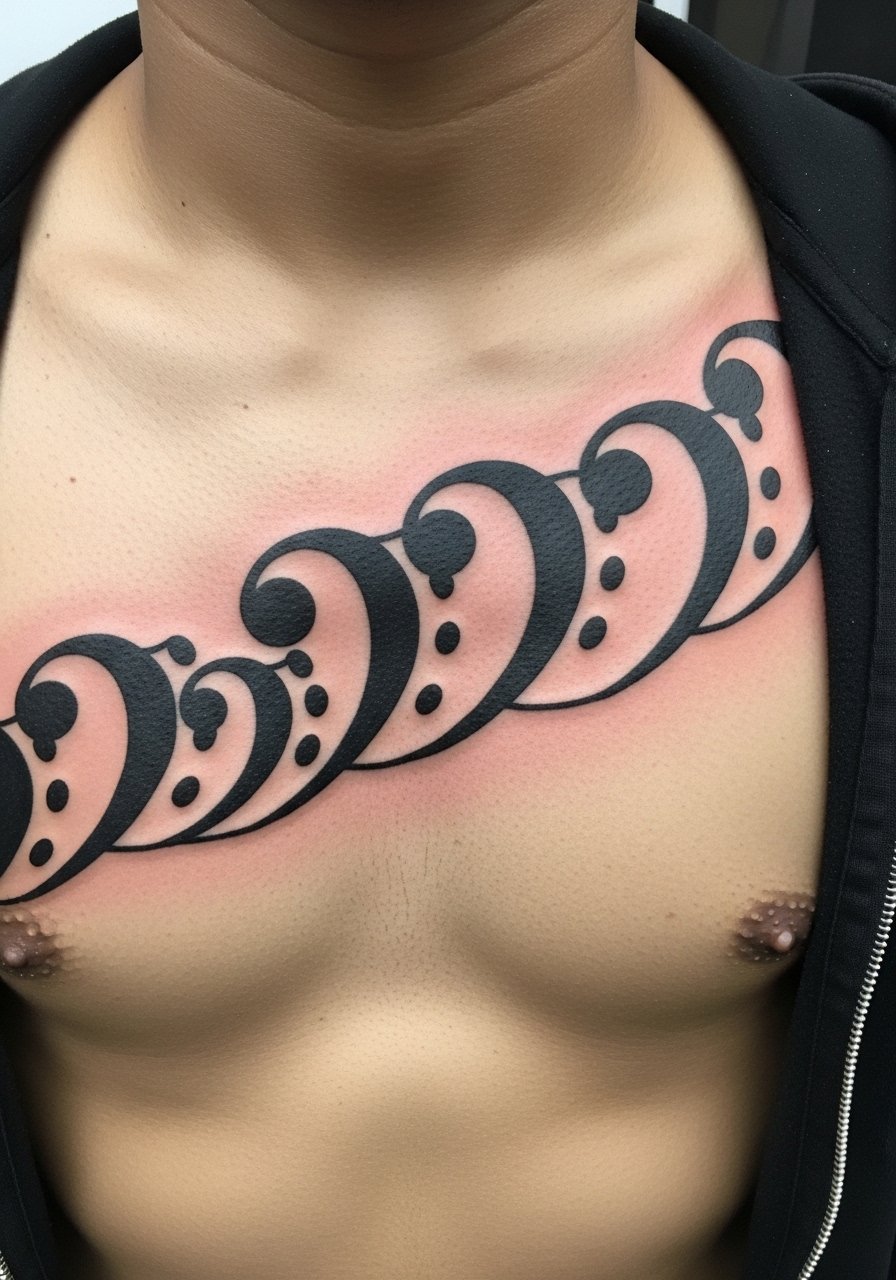 Heavy black keeps symbol clarity. Sternum placement is dramatic but demands strict aftercare to avoid prolonged irritation. Blackwork often ages best across tones; ask for healed images of black-heavy pieces on similar skin.