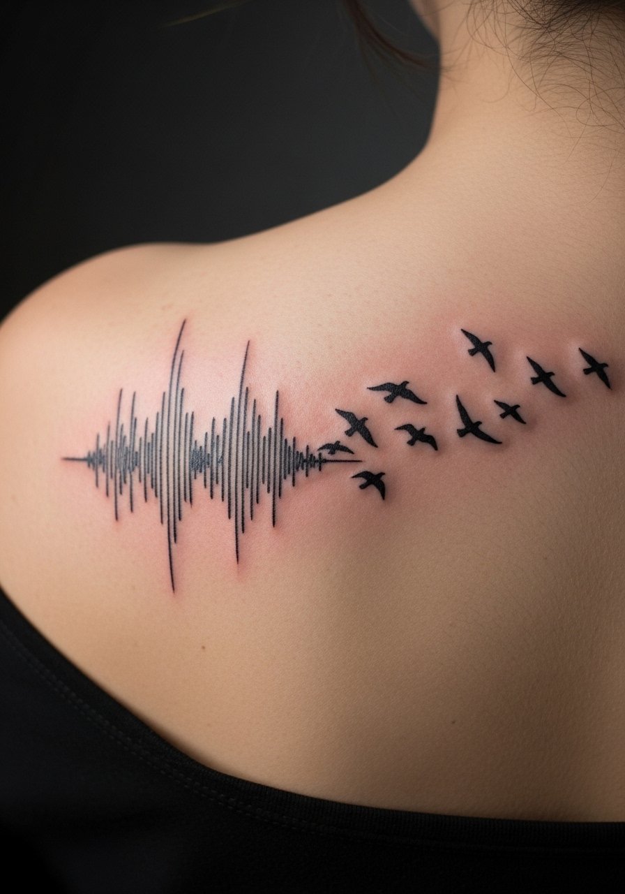 This creative angle feels alive—soundwave imagery transitioning into birds is one of the fresh concepts I keep seeing. Shoulder blade offers a flat canvas with low pain. The design reads well healed if the wave line is bold enough to survive subtle spread.