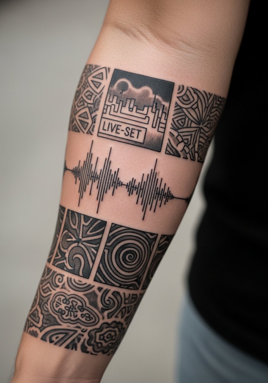 A waveform sleeve that maps a favorite live mix into the sleeve narrative is a fresh idea I haven't seen enough of. It works best when built into larger motifs for scale and reading distance. Forearms take sun—plan long-term maintenance and thicker anchor lines where the waveform should remain crisp.