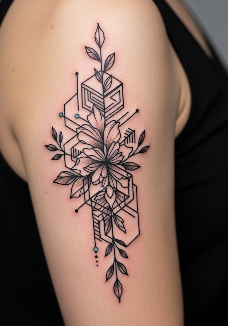 Geometric nature hybrids pair crisp triangles or mandalas with organic leaves or tiny landscapes. The upper arm is forgiving—low pain and excellent for showing off symmetry. Visually, the contrast between rigid geometry and soft botanicals creates a grounded, modern look. Healing goes smoothly if the linework has solid contrast; bold blackwork areas hold up best while thin geometric lines may soften slightly over time. A frequent slip-up is overcomplicating the geometry at small sizes; ask your artist to scale shapes so they age well. If you like the futuristic edge, look for artists who showcase both geometric and botanical pieces in their portfolios.