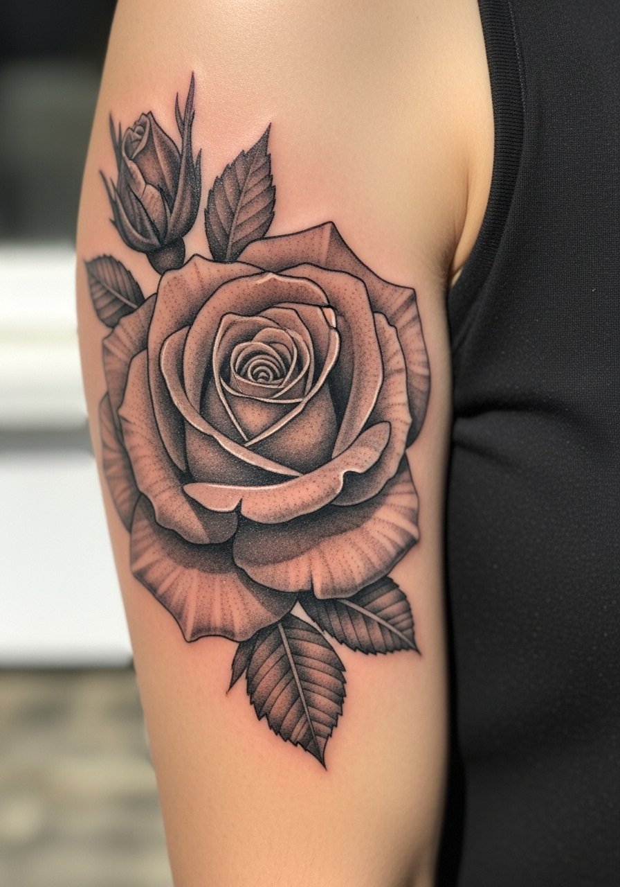 Botanical realism roses are a classic for a reason: they age with dignity. The bicep offers a smooth canvas for shading, and black & gray realism keeps the piece readable long-term. Expect steady tattooing rather than sharp scraping; sessions are comfortable for most people. Healing is straightforward—realism depends on contrast, so emphasize healed photos during your consult. A common error is adding tiny highlights or white ink as the main detail; white fades faster and can vanish on some skin tones. Look for artists experienced in floral realism and who can show healed results on similar skin tones to yours.