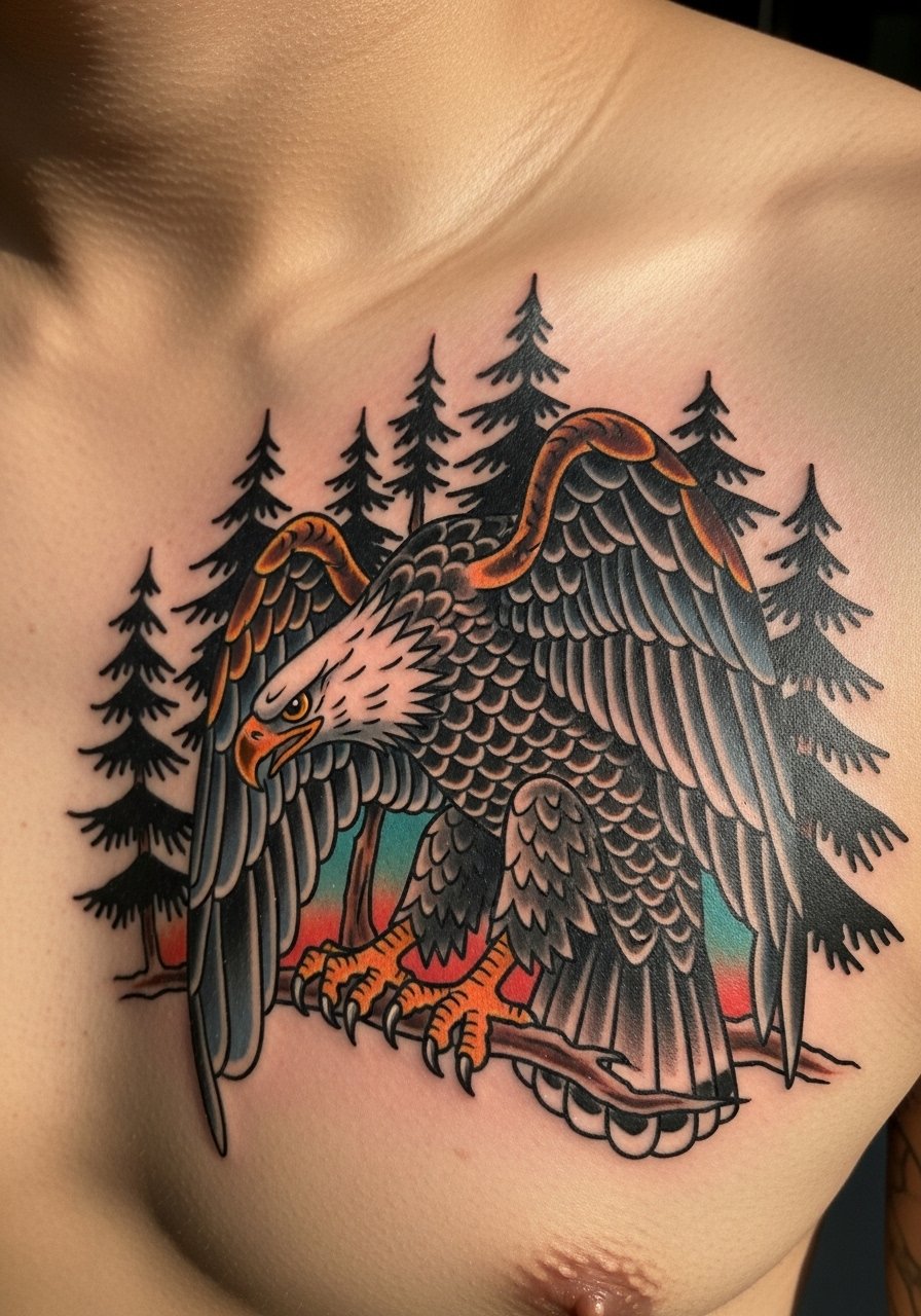 A neo-traditional eagle in a forest blends storytelling with bold linework. Chest placement gives scale and a dramatic canvas for saturated colors and expanded compositions. Expect more sensitivity around the sternum and collarbone, and plan sessions around comfort. Neo-traditional pieces photograph well and keep their graphic impact as they age because of strong outlines. A typical mistake is cramming too many small elements into a chest piece—let focal areas breathe. If you want this vibe, I recommend artists like Valerie Vargas-style colorists who balance illustrative detail with robust line integrity.