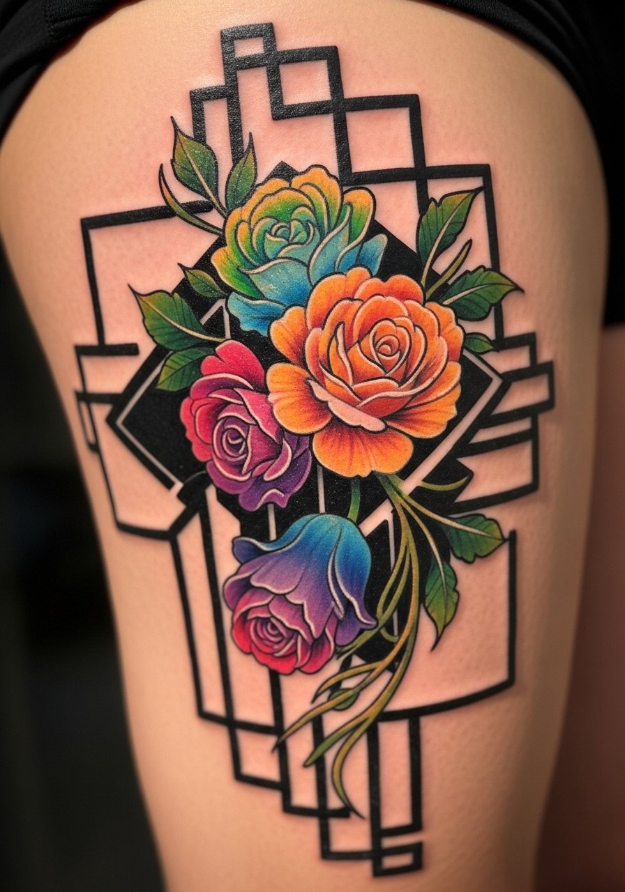 Thigh tattoos are ideal for surreal floral and geometric mashups—there’s space to mix painterly watercolor gradients with crisp shapes. Pain is usually lower on the fleshy thigh and sessions are comfortable. Expect peeling during initial weeks as colors settle; watercolor areas may look muted then brighten once fully healed. A common misstep is overloading the composition with too many color transitions—ask the artist to prioritize a limited palette for longevity. Artists who blend geometric precision with painterly florals will give you that grounded-yet-surreal aesthetic.