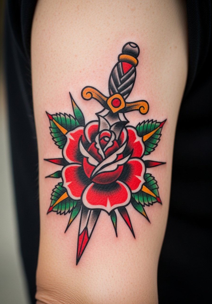 A traditional rose and dagger is a classic that photographs cleanly and ages reliably because of its bold lines and limited palette. The outer bicep is a low-pain, high-visibility spot that resists constant friction. Healed examples show the benefits of strong outlines—tiny details blur less when anchored by thick edges. Don’t ask to cram overly intricate shading into a small traditional piece; simplicity is the strength here. If you like classic motifs, find an artist who shows healed traditional work on similar skin tones.
