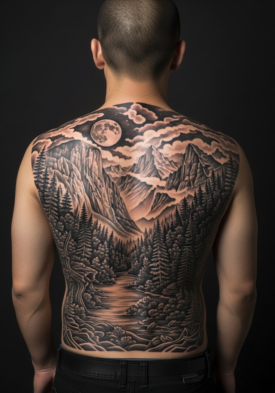 A tree-and-mountain back piece reads like a landscape you can live in. Large black & gray realism holds up well because of layered shading and strong contrasts. Expect multiple sessions with varied pain depending on spine proximity. Healing is lengthy for full-back work—give yourself downtime after long sessions and plan clothing to avoid constant rubbing. A common misstep is trying to force micro-detail across a vast canvas; effective large pieces use strong focal areas and simpler supporting elements. Artists who do illustrative landscapes can show you composition options that remain readable as your skin changes.