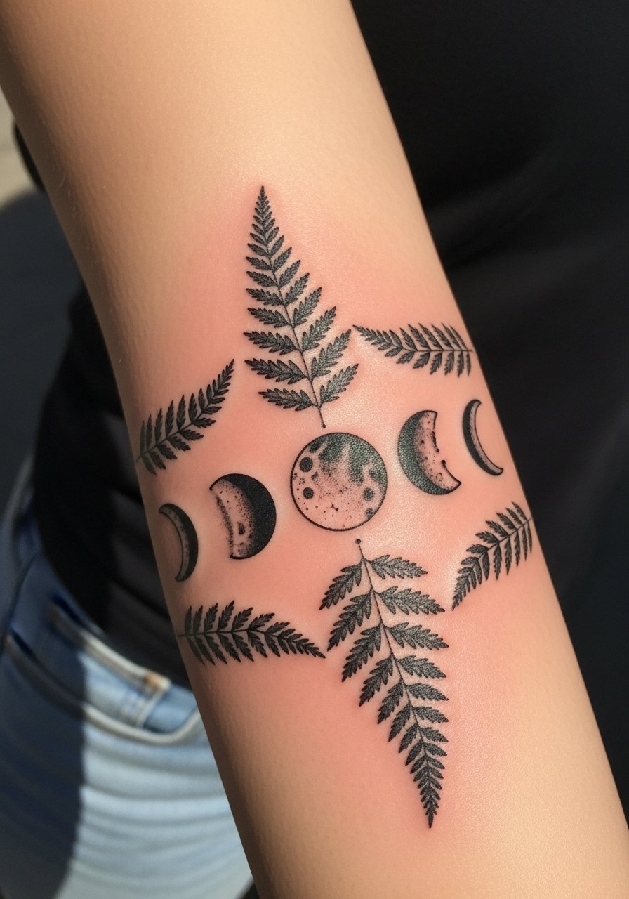 Moon phases paired with a fern create a calm, cyclical symbol of renewal. Forearm placement allows for visible daily reminders and generally mild pain. Fine line moon crescents hold up if sized correctly; avoid tiny crescents that fill in. Healing is straightforward—keep it moisturized and out of direct sun. Ask for healed forearm examples so you can see how thin crescents age and whether slight bolding is recommended.
