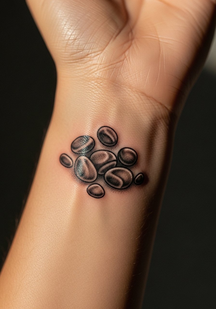A cluster of seaside pebbles on the wrist feels grounding and tactile. Wrist placement shows easily in photos but gets more sun exposure, so plan for sunscreen once healed. Micro-realism requires careful shading but works well at small sizes when the artist has healed examples. The key mistake is over-detailing tiny pebbles—simpler shading keeps them readable. From what I’ve seen, realistic black and gray pebbles age neatly compared with tiny color gradients.