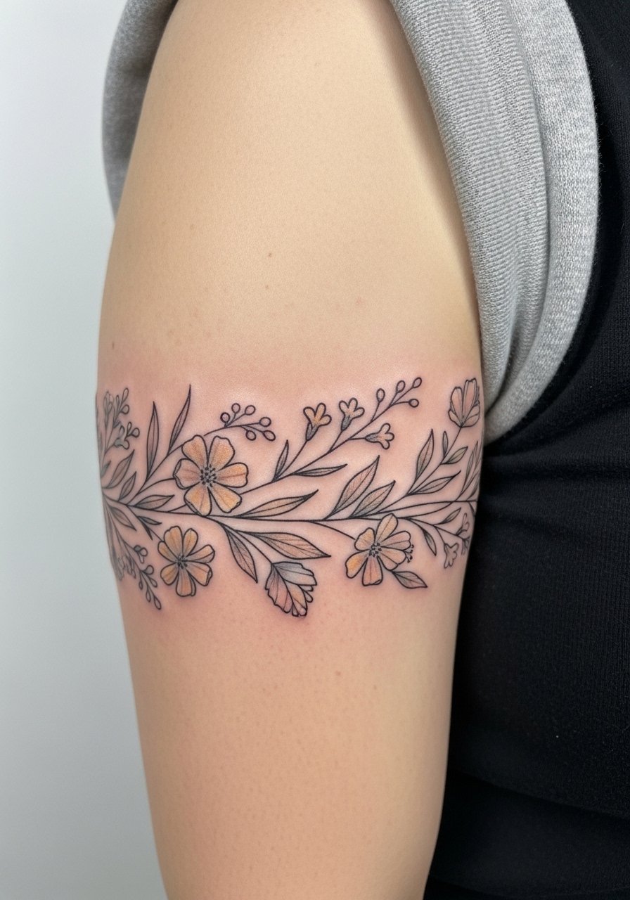 A meadow band circles the upper arm like a private landscape. It’s perfect if you want continuous nature imagery without a full sleeve. Pain is low, and the area heals well. Keep fills soft and avoid too many ultra-fine stems that blur. From experience, artists who balance linework and gentle color are best for this look. Mention that you want healed photos during your consult to judge saturation choices.