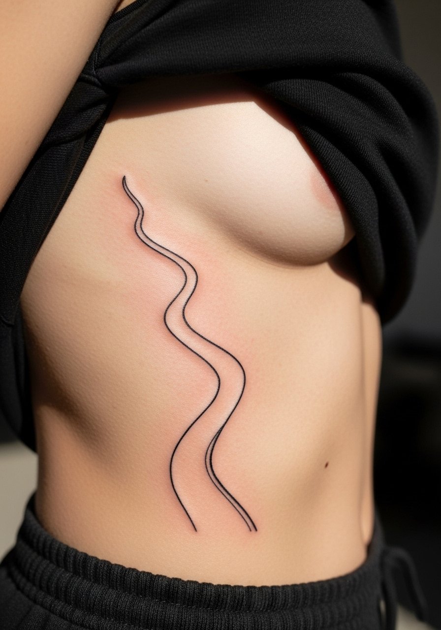 A continuous river line on the rib side follows your body’s curves and reads like motion. Ribs are sensitive, so expect higher pain and split sessions. Minimalist linework can blur if the line is too thin—ask for a slightly stronger weight so the flow remains visible after healing. Keep aftercare strict: no tight clothing rubbing the area. Artists used to long-flowing compositions will advise on line weight for longevity.