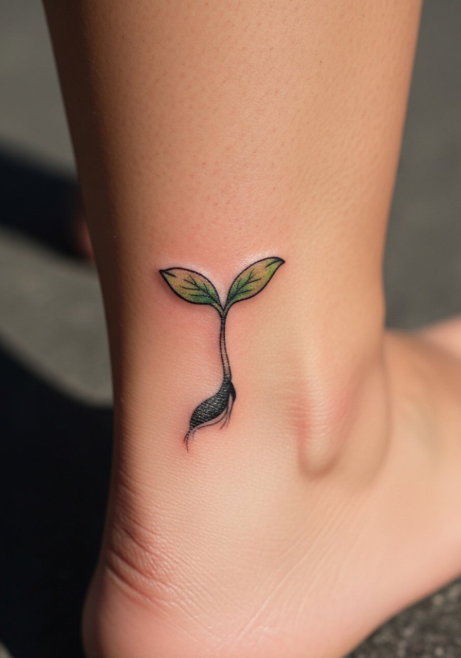 A tiny seedling behind the ankle is a discrete, hopeful symbol. The spot gets sun and friction, so expect the ink to soften over time; thicker outlines help. Sessions are quick and healing is manageable if you watch footwear rubbing. Don’t ask for ultra-fine roots—simplicity ensures the sprout reads well after months. This is a lovely small nature tattoo for someone wanting low commitment with high meaning.